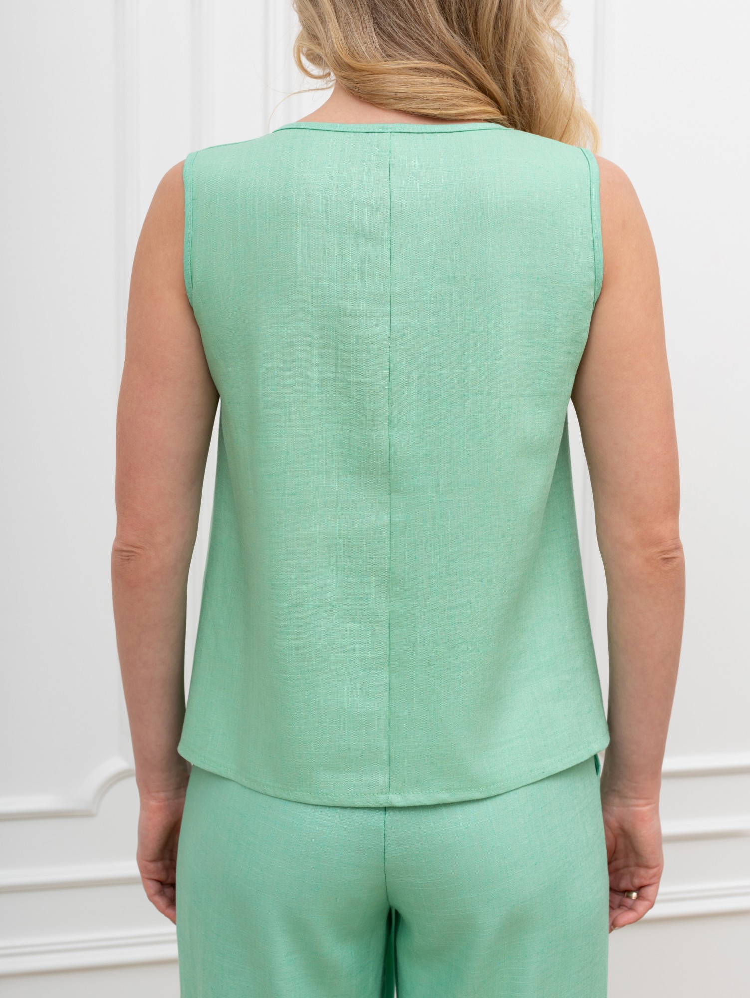 Блузка-топ женская из гладкокрашеного тканого полотна, полуприталенного силуэта, без рукавов, с горловиной овальной формы. Горловина и проймы окантованы основным материалом.