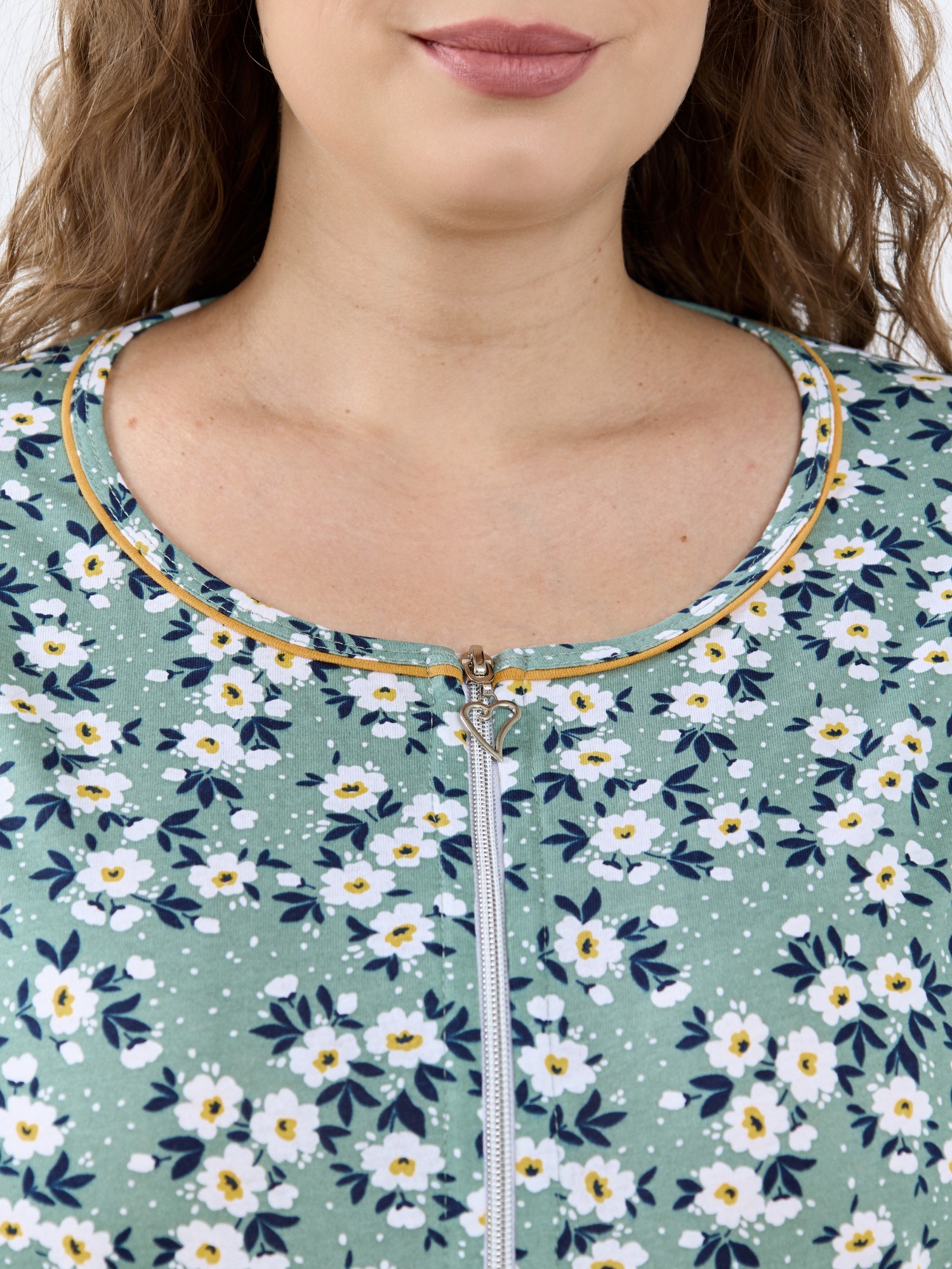 Халат - женский трикотажного полотна «кулирка» с набивным рисунком, свободного покроя, расширенный к низу, с короткими цельнокроеными рукавами, горловиной овальной формы, окантованной двойным кантом и разрезами в боковых швах, центральной бортовой застежкой на тесьму « молния». Рукава с притачными манжетами и кантом, полочки с отрезными бочками в нижней части и боковыми карманами на уровне бедер. Верхние срезы карманов обработаны притачными планками с кантом.