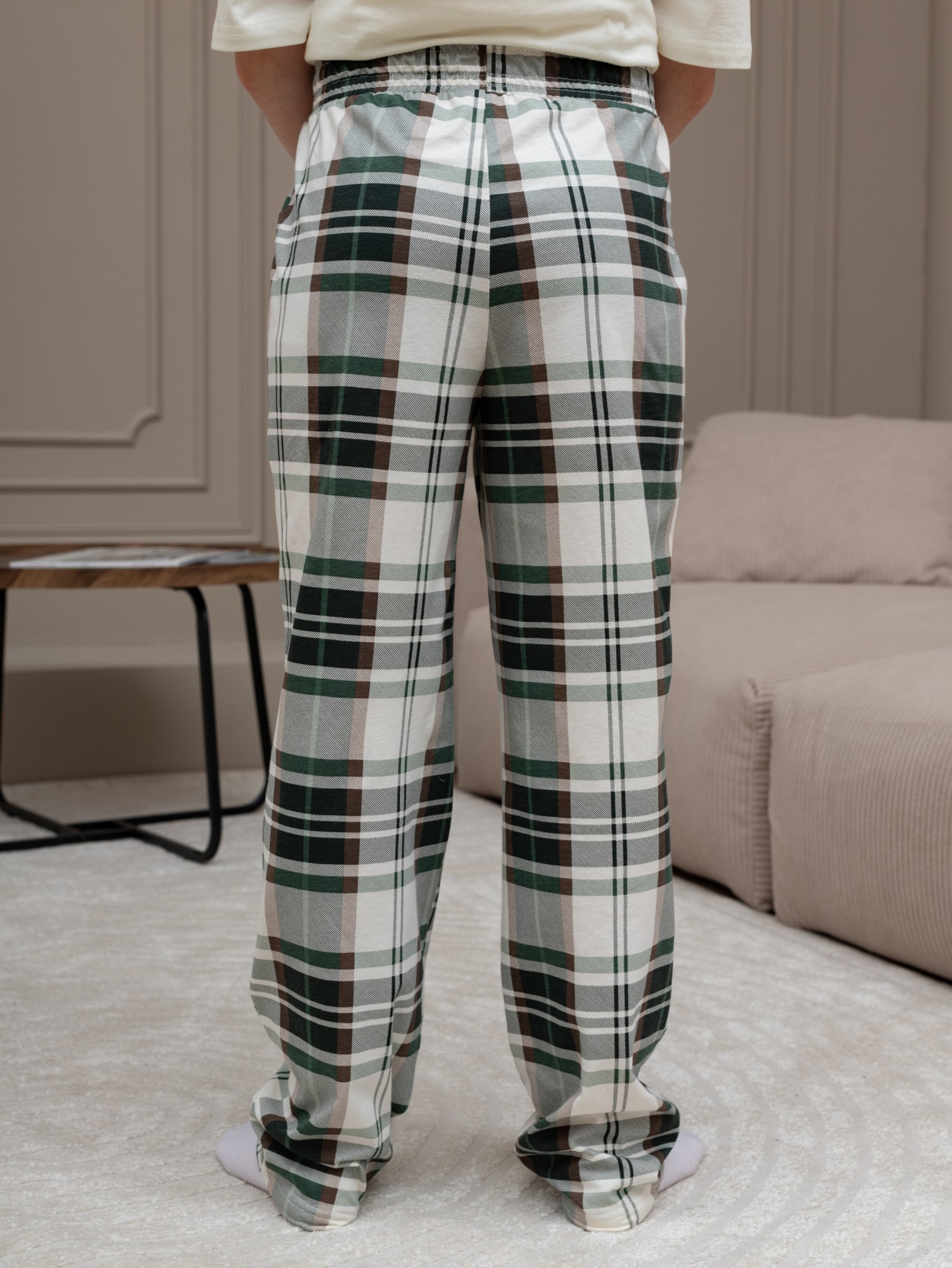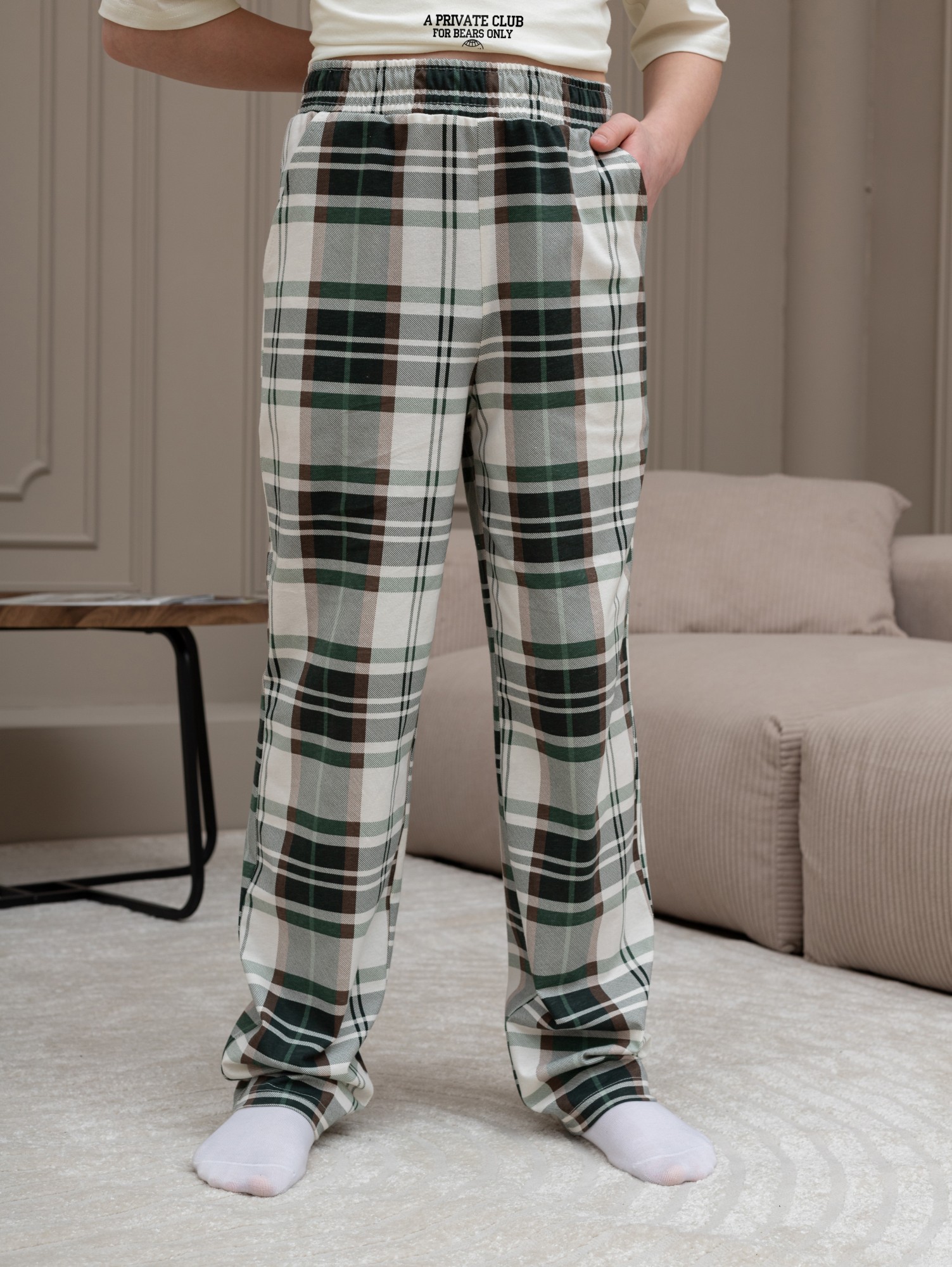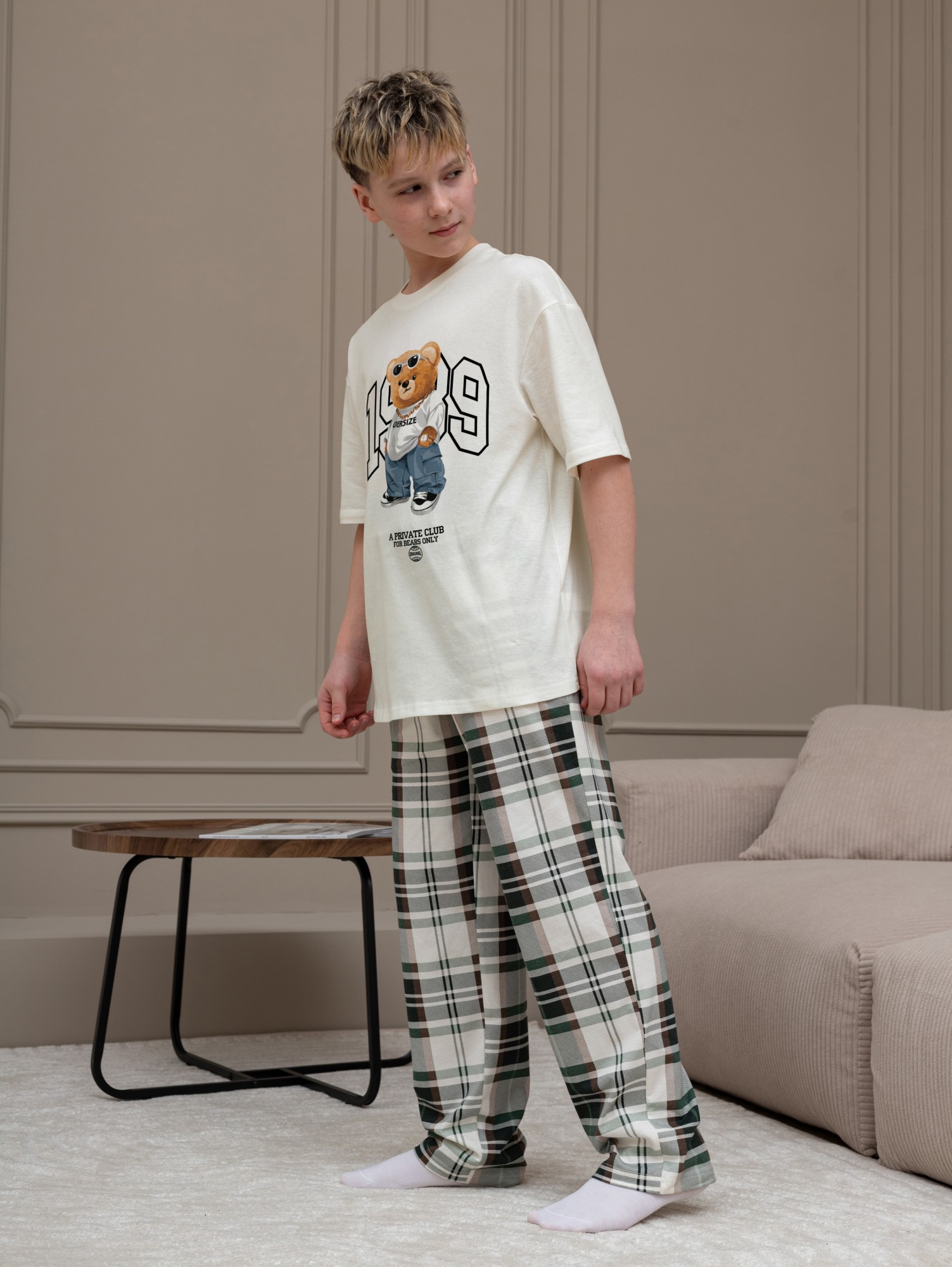 Костюм для мальчика, состоящий из футболки и брюк. Футболка однотонная с принтом на груди; модель свободная, со спущенной линией плеч, втачными короткими рукавами и овальным вырезом горловины. Брюки из полотна с набивным рисунком эксклюзивного дизайна, прямые, с боковыми карманами с обтачными входами, на притачном поясе с отстроченной эластичной тесьмой.