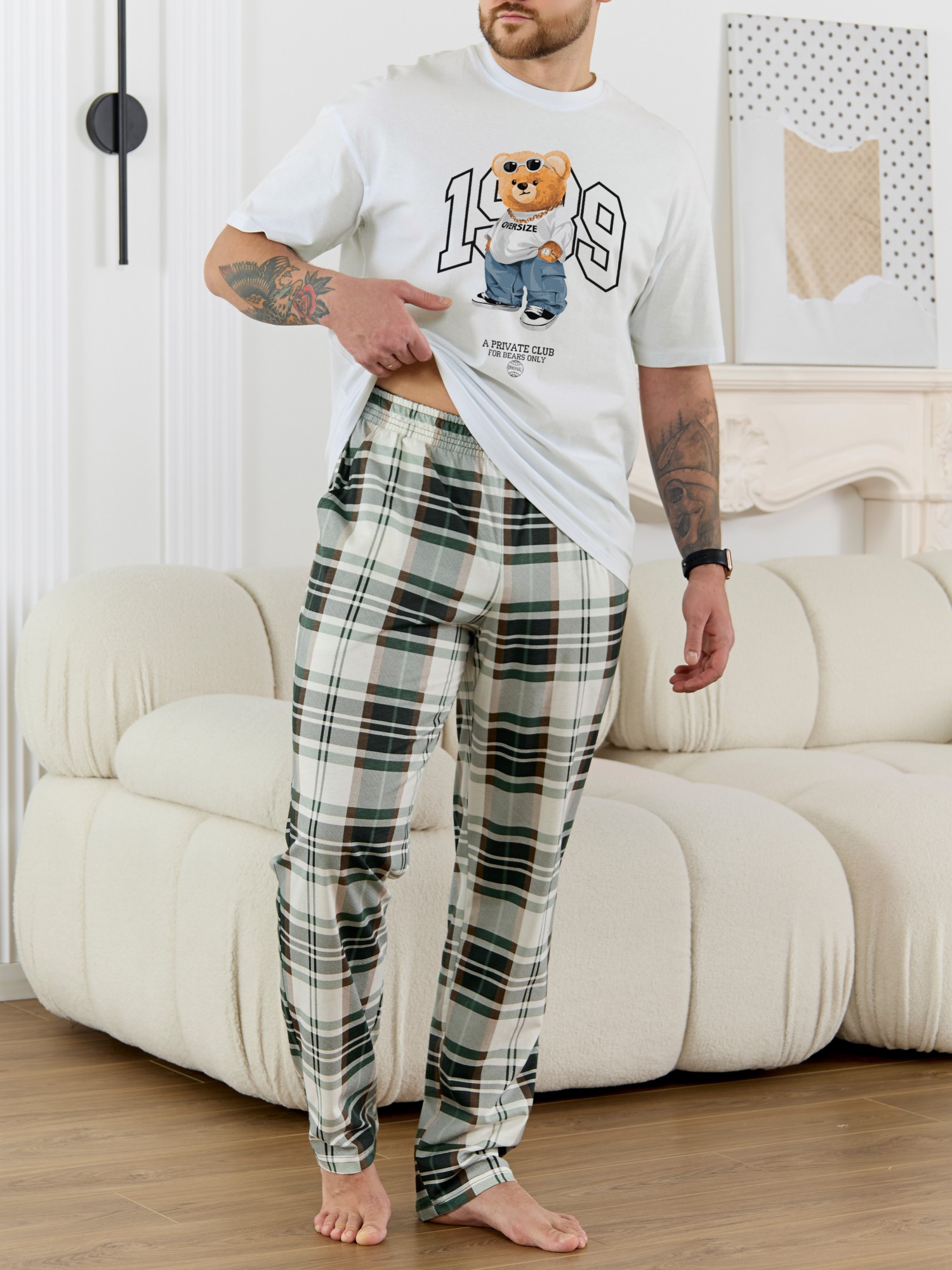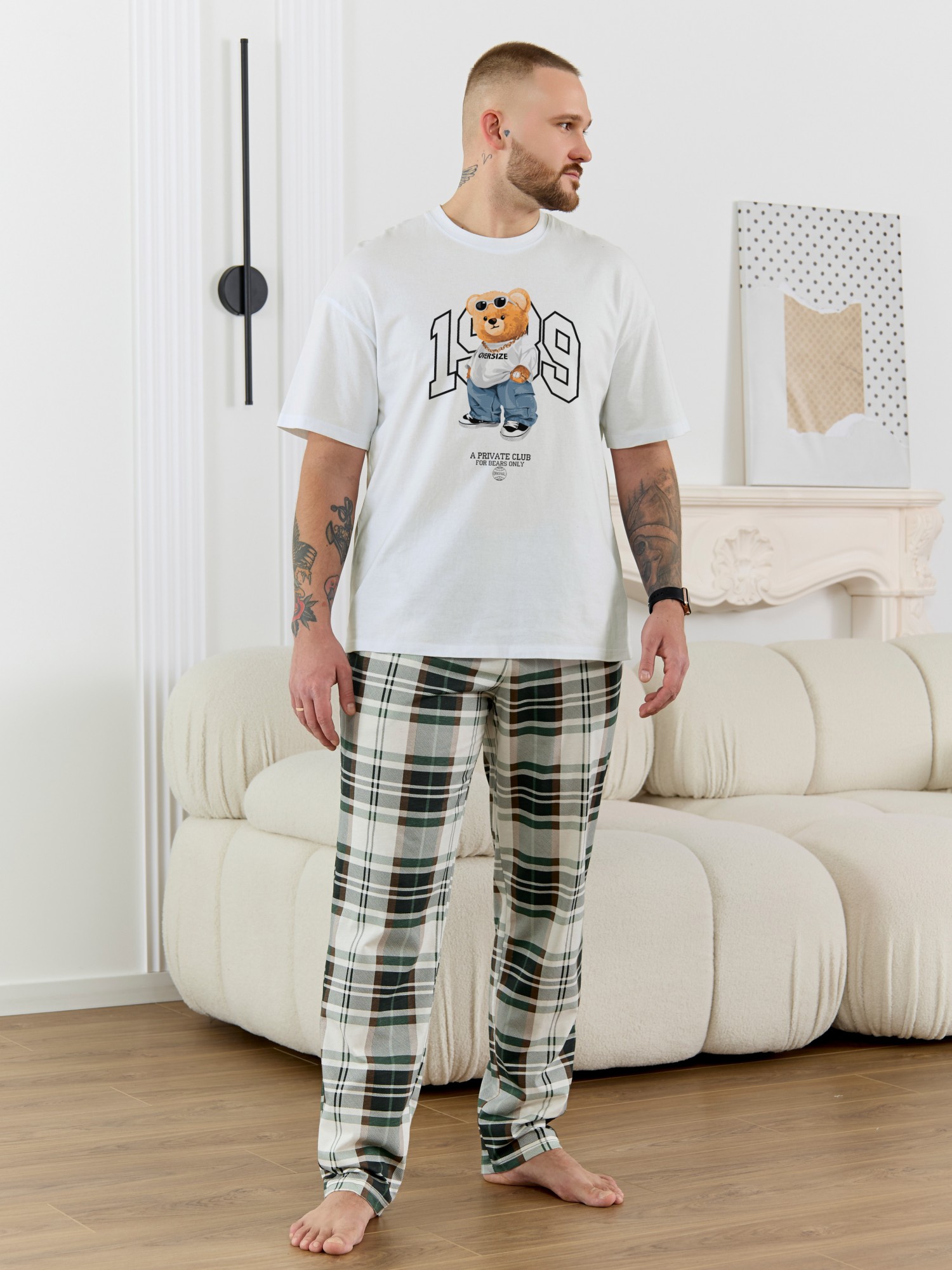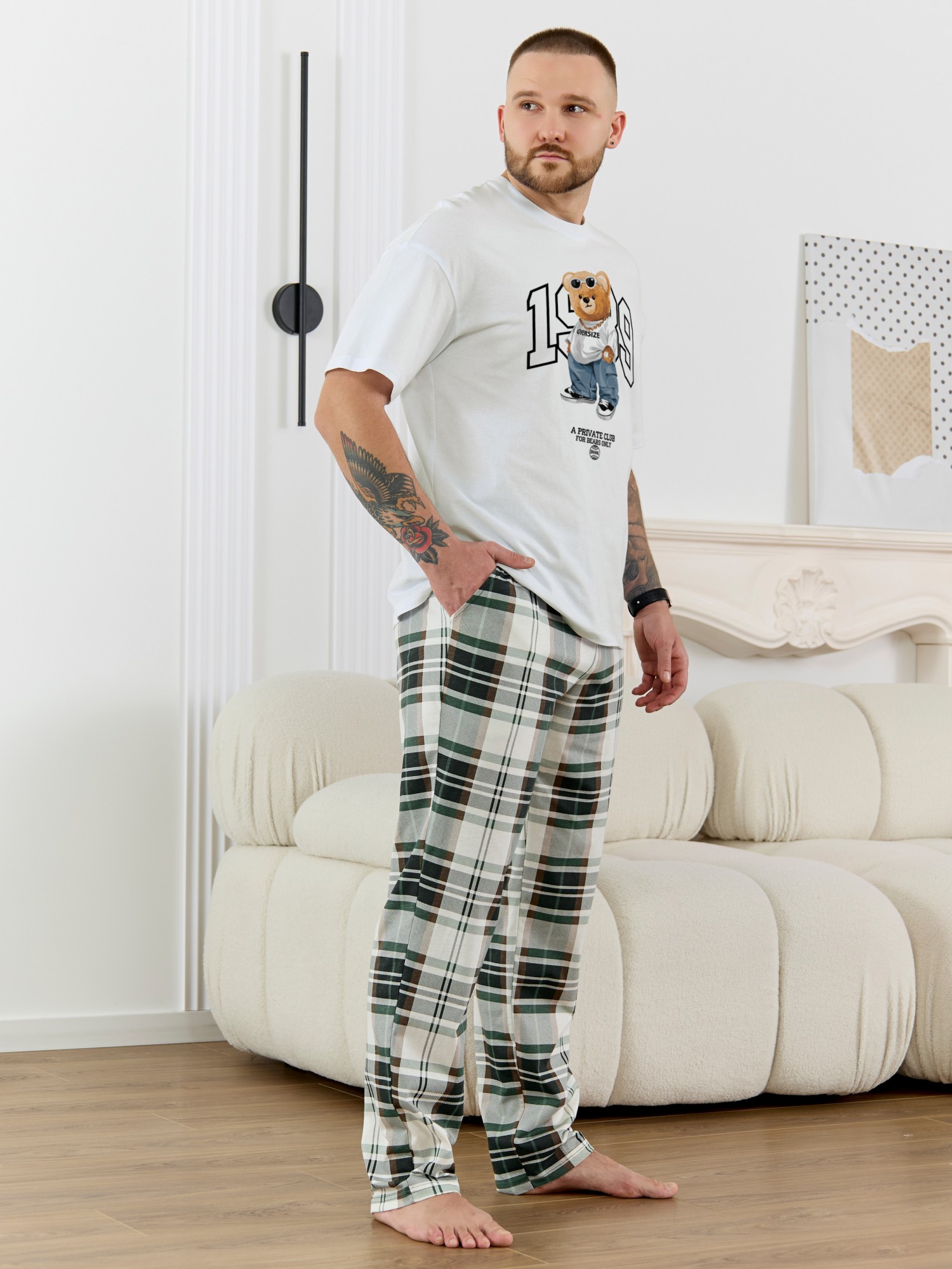 Костюм мужской, состоящий из футболки и брюк. Футболка однотонная с принтом на груди; модель свободная, со спущенной линией плеч, втачными рукавами, овальным вырезом горловины. Брюки из полотна с набивным рисунком эксклюзивного дизайна, прямые, с боковыми карманами с обтачными входами, на притачном поясе с отстроченной эластичной тесьмой.