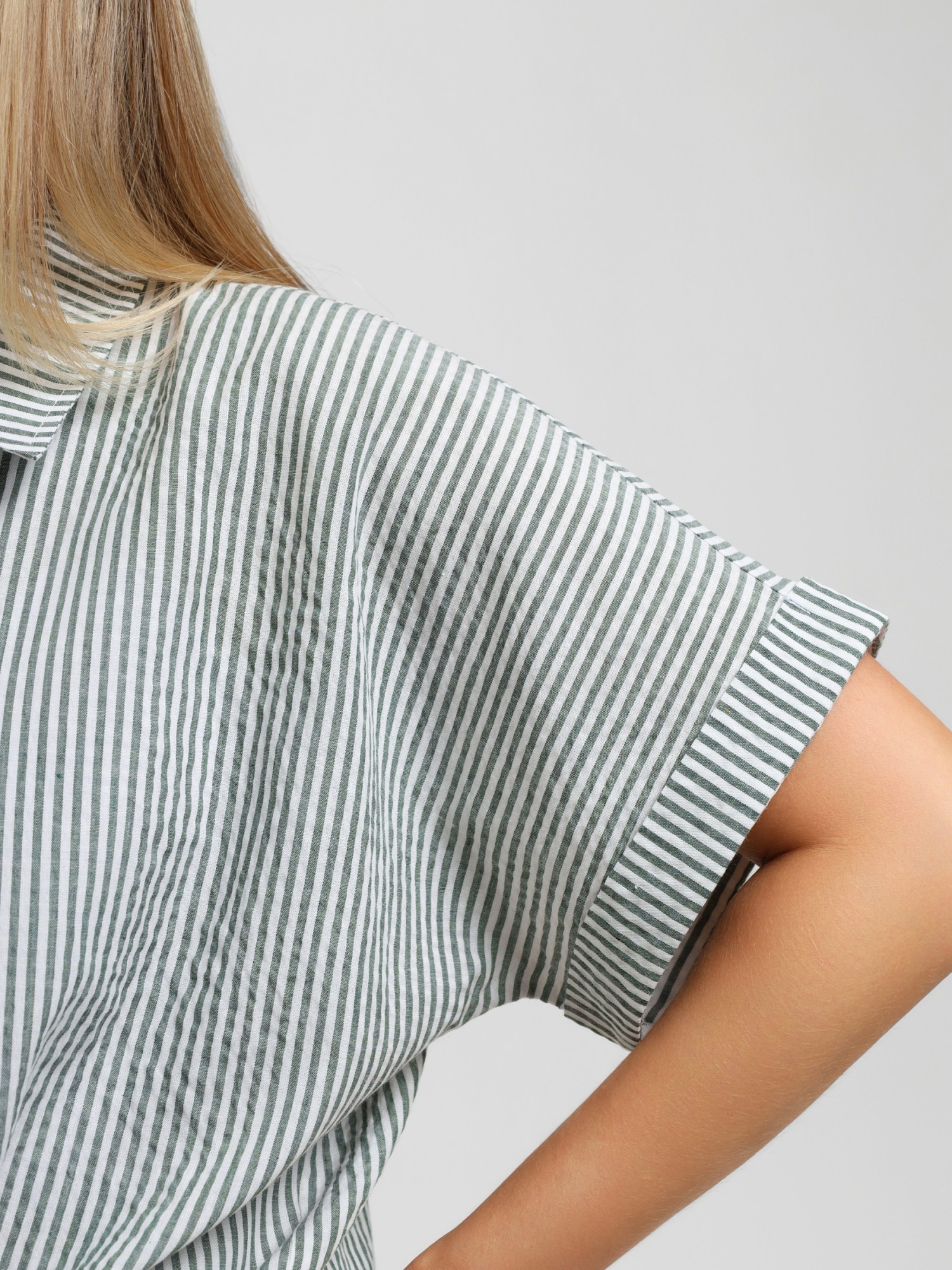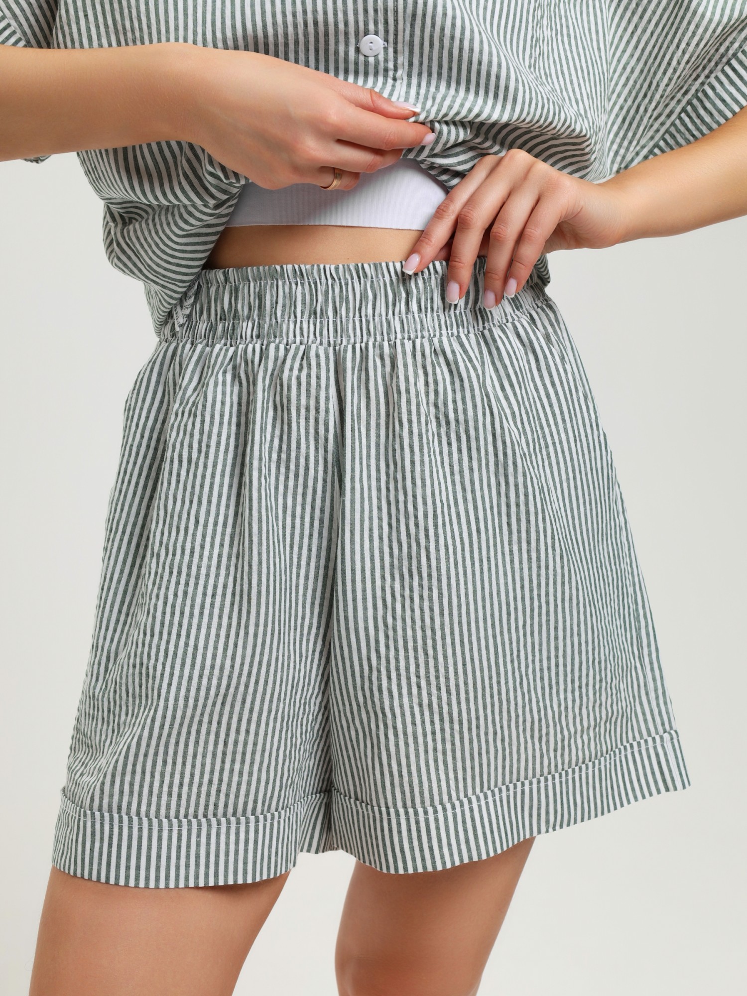 Костюм молодежный из тканого полотна в полоску, состоящий из блузы - рубашки и шорт. Блуза – укороченного силуэта, свободного покроя, с короткими цельнокроеными рукавами, обработанными манжетами, акцентными декоративными завязками спереди, отложным воротником и центральной бортовой застежкой на петли и пуговицы.Шорты - свободные, средней длины, с карманами в боковых швах, на притачном поясе с эластичной тесьмой внутри, с двойной подгибкой низа имитирующей манжет.