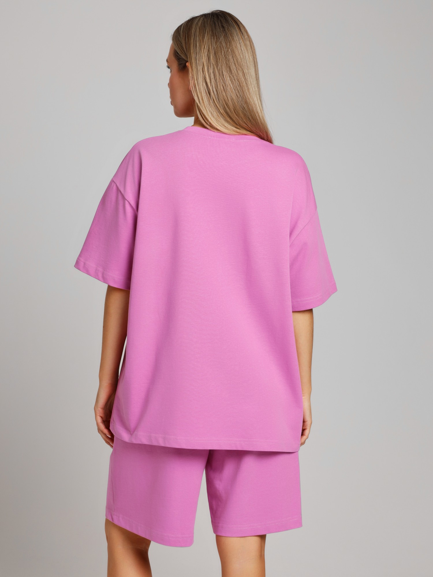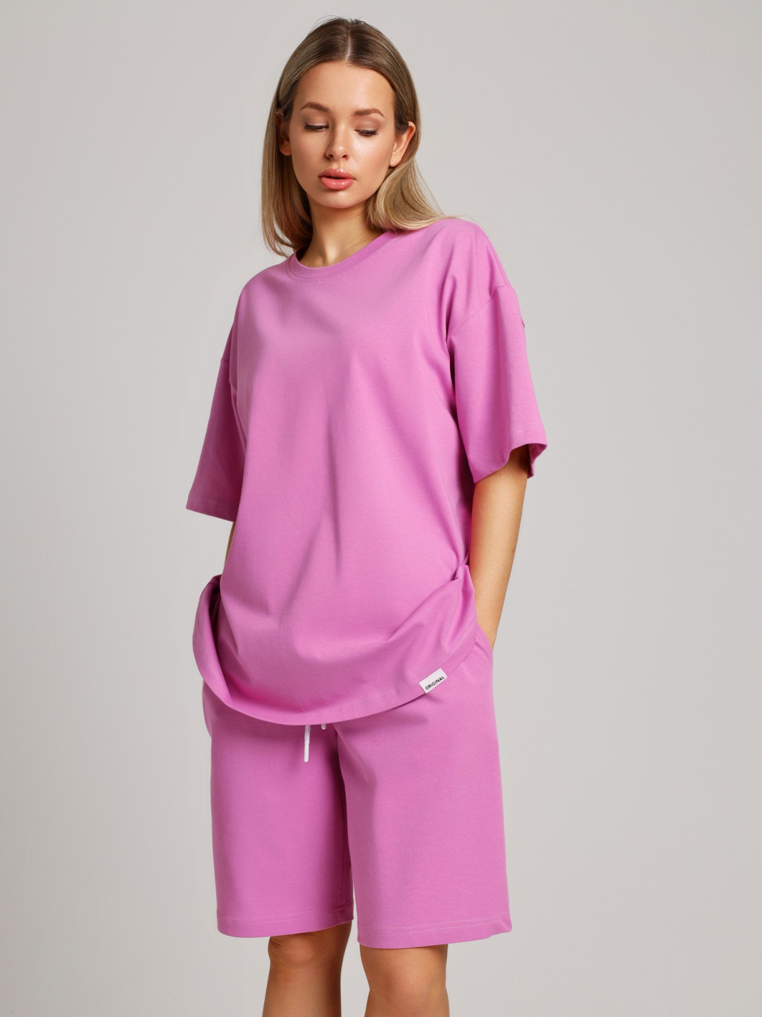 Костюм женский из плотного гладкокрашеного трикотажного полотна "кулирка", состоящий из футболки и шорт. Футболка - свободного покроя, с удлиненными плечевым и швами, короткими втачными рукавами и горловиной овальной формы, обработанной втачной планкой. В нижней части переда слева настрочен декоративный элемент прямоугольной формы. По горловине проложена отделочная строчка. Шорты - классического покроя, на притачном поясе с эластичной тесьмой внутри и карманами в боковых швах. Для регулирования степени прилегания шорт по талии в пояс вставлен шнурок, продетый через два отверстия в соединительных швах в центре пояса.