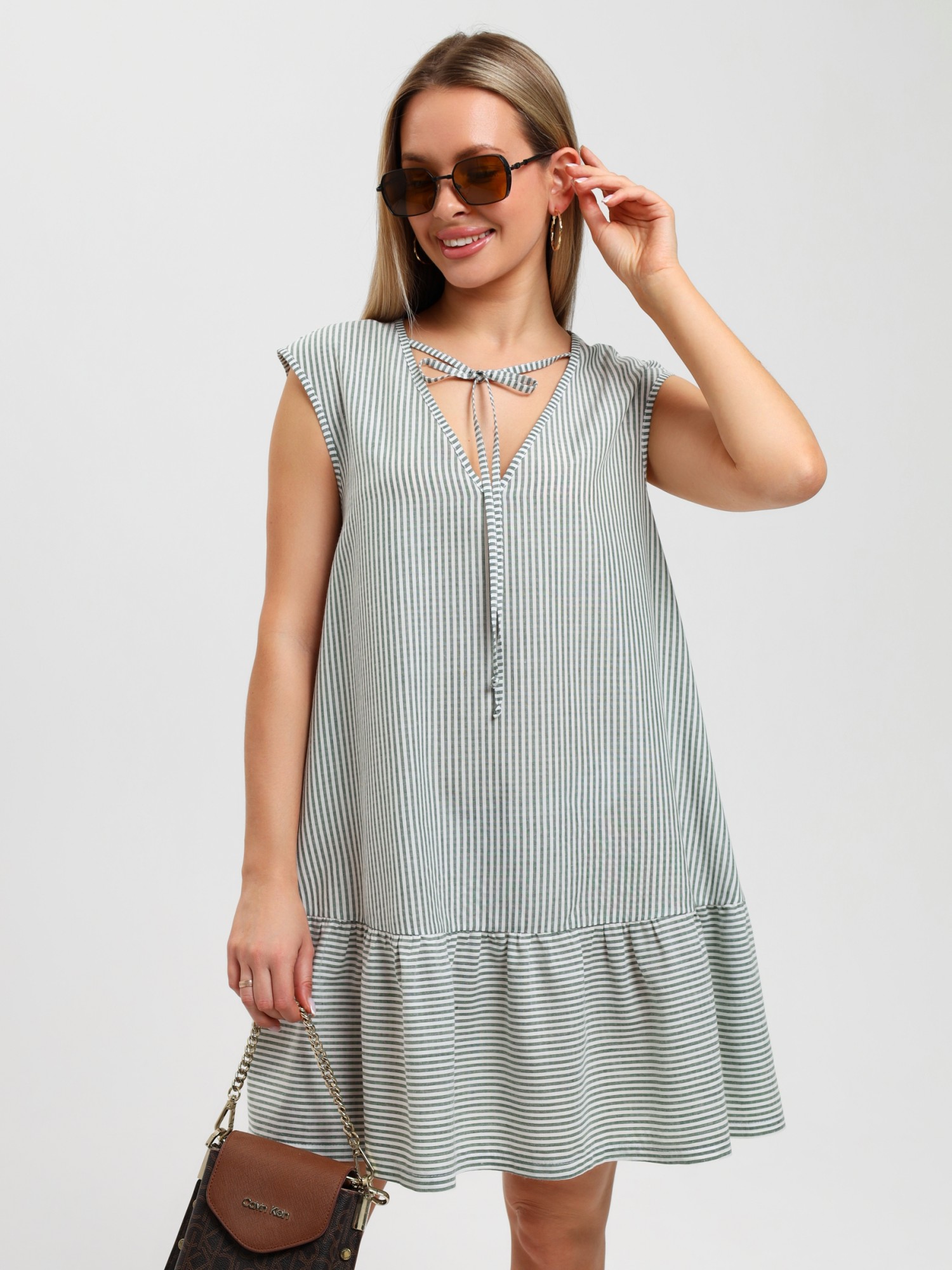 Платье молодежное, свободного покроя, с V- образным вырезом горловины, без рукавов. Горловина и проймы окантованы основным материалом, низ изделия с притачной оборкой. Акцентной деталью платья являются узкие завязки, вставленные в горловину с изнаночной стороны, завязывающиеся на бант спереди, которые при желании изменить внешний вид изделия, могут быть убраны вовнутрь.