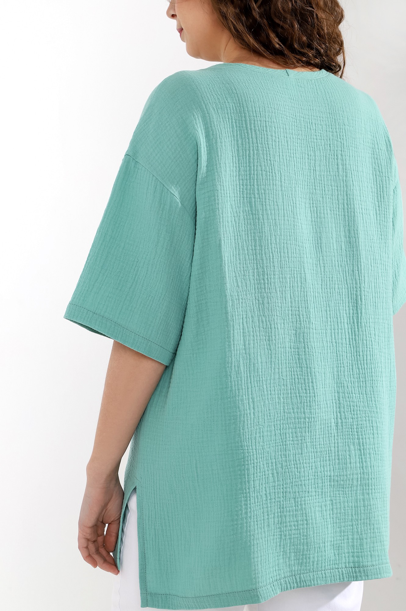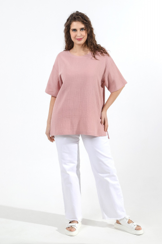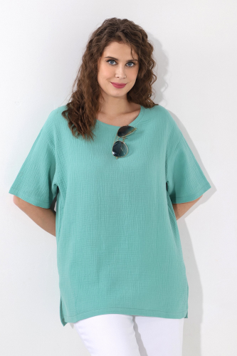 Блуза женская из гладкокрашеного тканого полотна «муслин», прямого силуэта, с горловиной овальной формы и короткими втачными рукавами. Горловина обработана втачной планкой, в боковых швах разрезы.