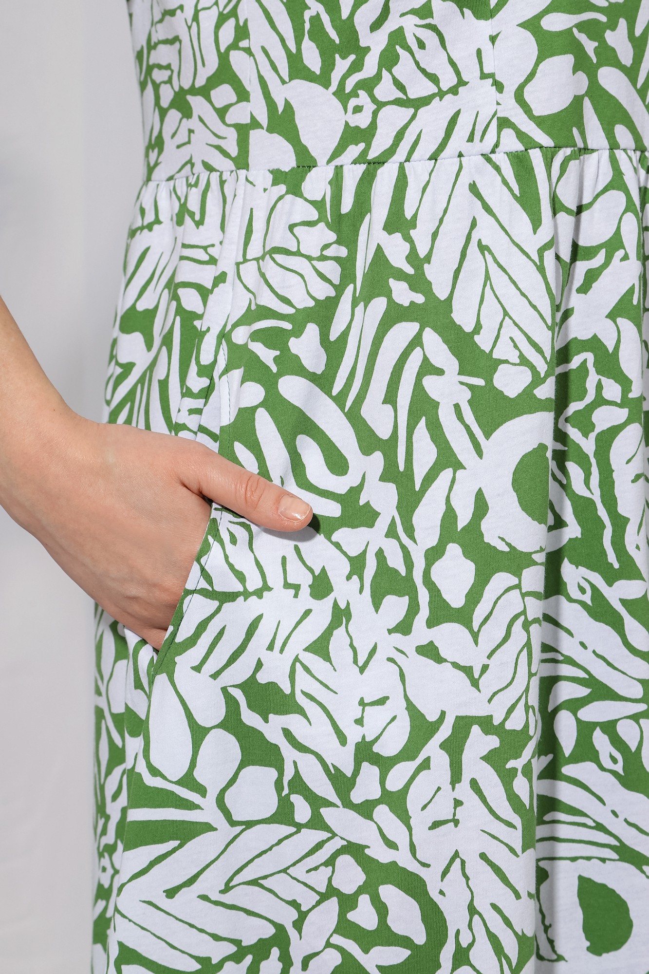 Платье из трикотажного полотна «кулирка» с набивным рисунком, отрезное по талии, с короткими втачными рукавами, горловиной V-образной формы, окантованной основным материалом и карманами в боковых швах. Полочка – с рельефами, выходящими из плечевых швов. Входы в карманы окантованы. Юбка – широкая, присборенная по шву стачивания с лифом и оборкой по низу.