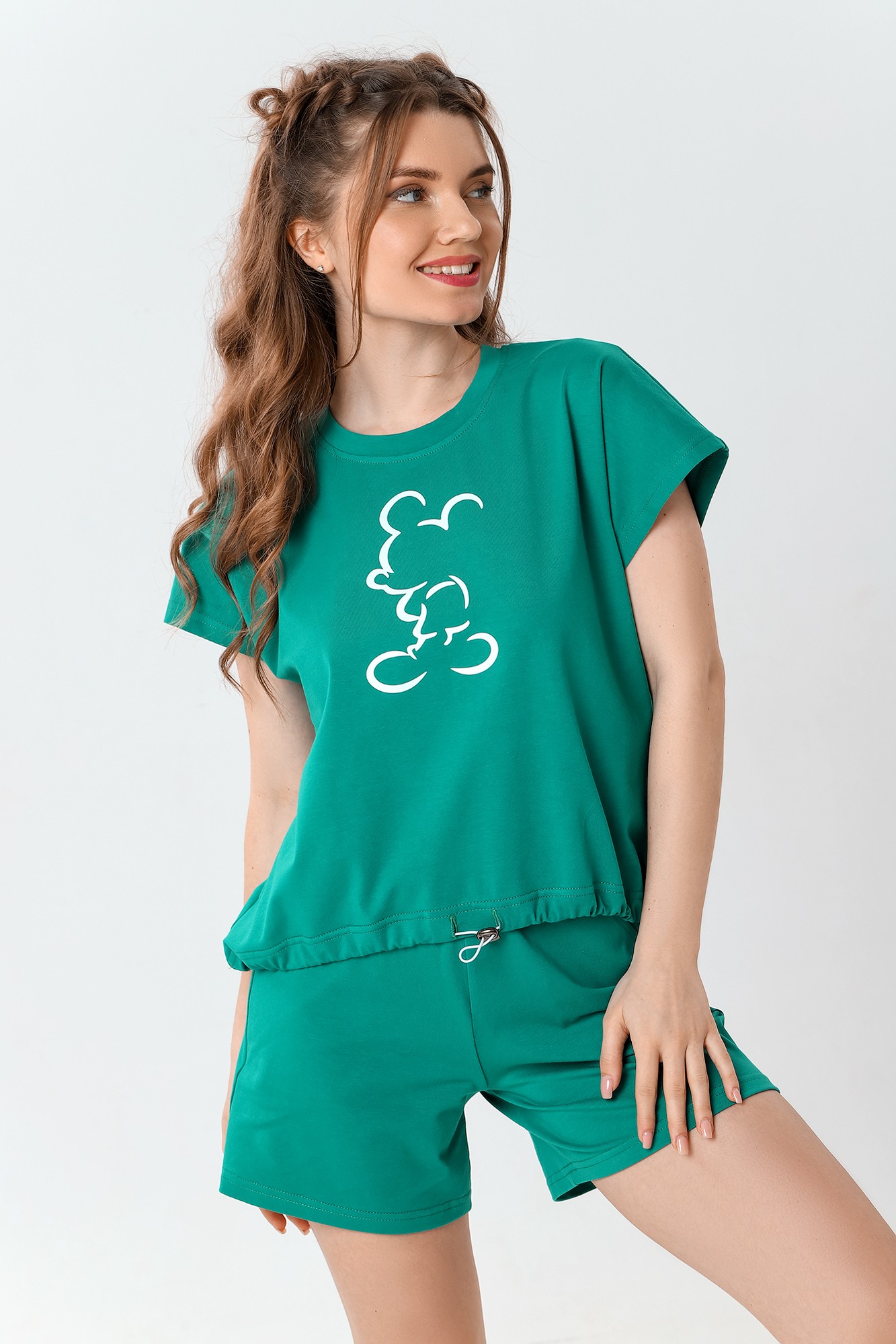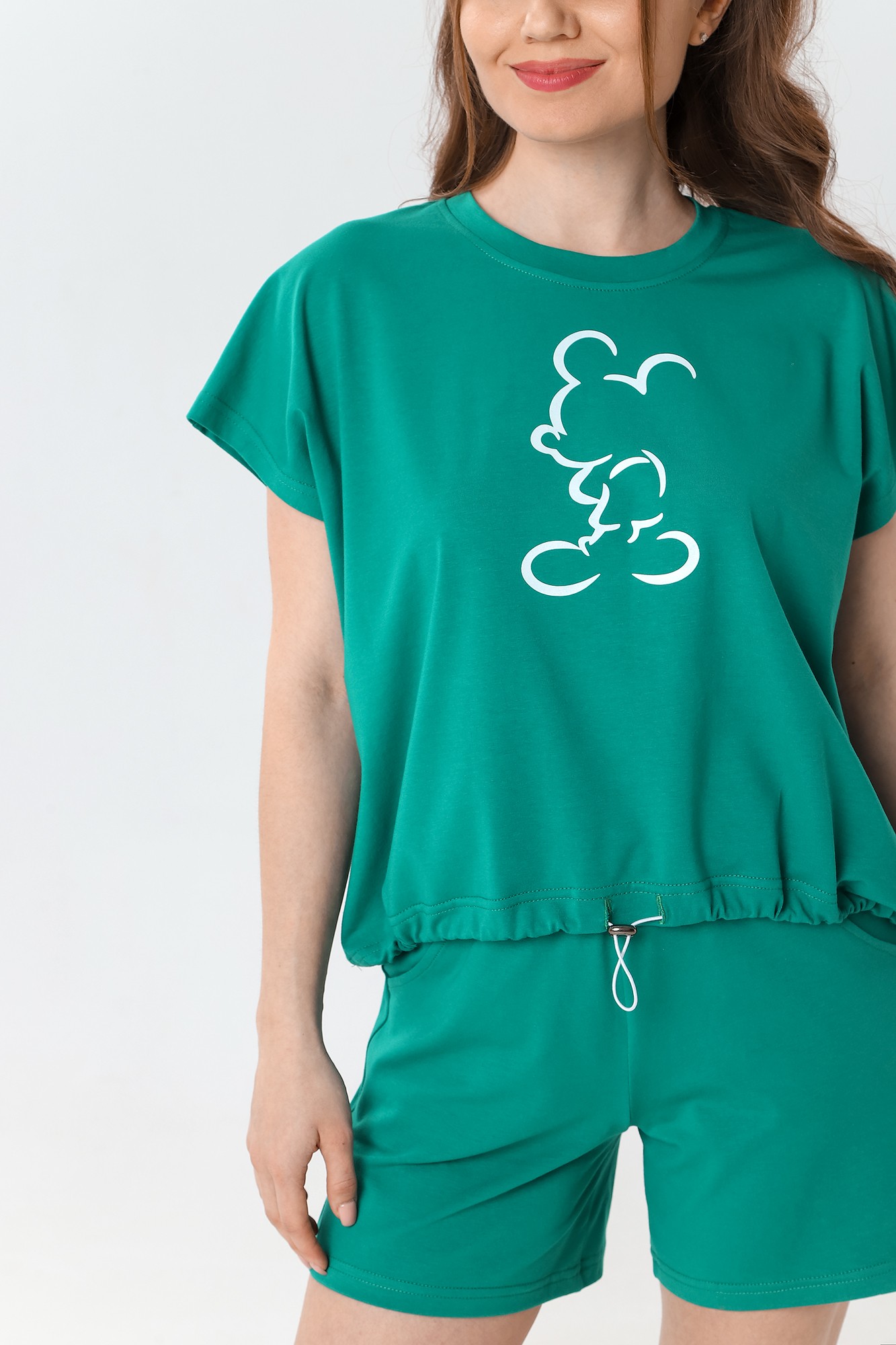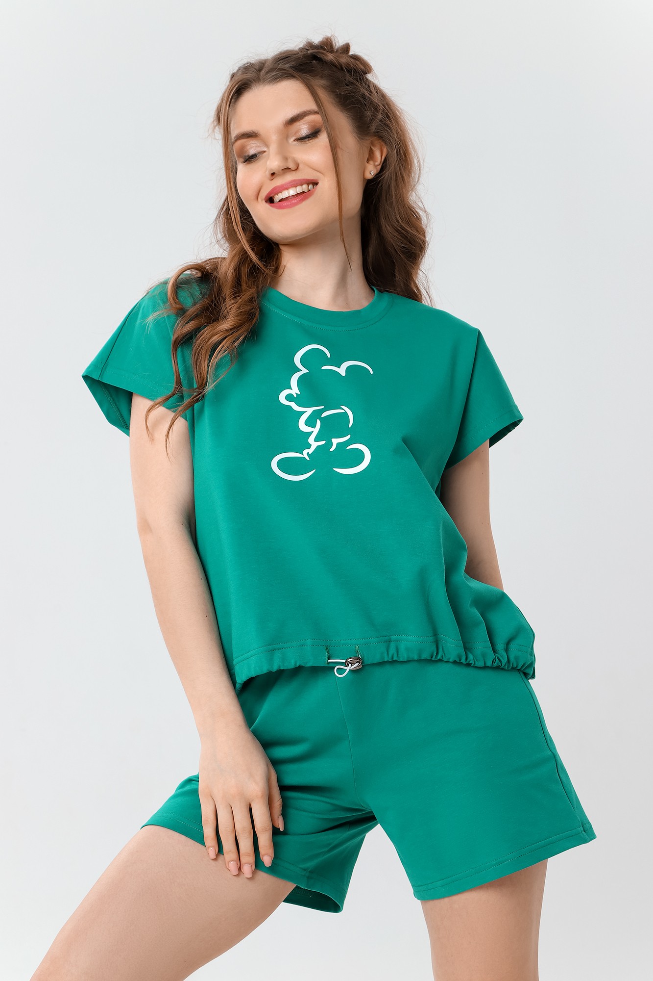Футболка – свободного покроя, с короткими цельнокроеными рукавами, горловиной овальной формы, обработанной втачной планкой. На полочке принт, выполненный в технике «шелкография», низ изделия – подгибка с вложением эластичной шляпной тесьмы, продетой через две обметанные петли и регулируемые по длине с помощью металлического фиксатора.
