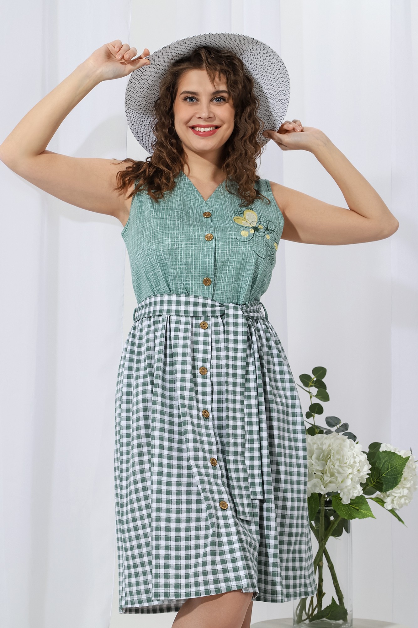 Сарафан из трикотажного полотна «кулирка» в сочетании двух видов в единой цветовой гамме: с мелкоузорчатым набивным рисунком, имитирующим ткацкое переплетение «рогожка» и с рисунком в мелкую клетку, отрезной по линии талии, с V-образной горловиной, центральной бортовой застежкой на обметанные петли и пуговицы и вышивкой на левой полочке лифа. Горловина спинки и проймы окантованы основным материалом. Юбка присборена по шву соединения с лифом. Съемный завязывающийся пояс фиксируется двумя шлевками из окантовки, вставленными в боковые швы на уровне талии.