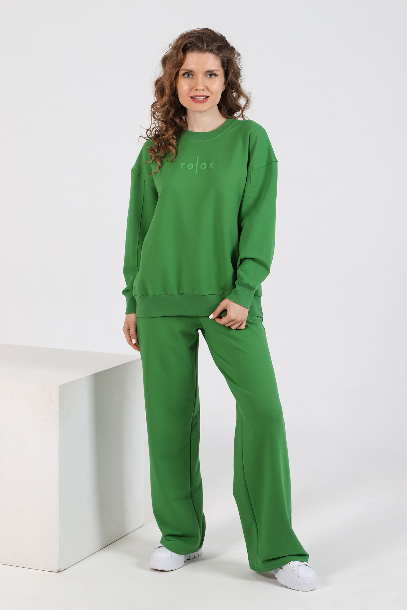 Костюм из гладкокрашеного трикотажного полотна «футер-двунитка», состоящий из джемпера и брюк. Джемпер - прямого силуэта, с длинными втачными рукавами, горловиной овальной формы, обработанной втачной планкой, притачным поясом и принтом на полочке, выполненным методом шелкографии. Манжеты рукавов, планка горловины и полупояса по низу изделия выполнены из эластичного полотна «рибана» в тон основному материалу, боковые швы смещены в сторону переда. Брюки – длинные слегка расширенные книзу, на притачном поясе с эластичной тесьмой внутри и карманами в боковых швах.