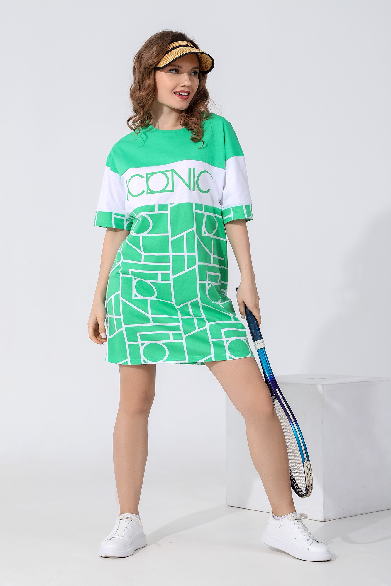 Туника молодежная из трикотажного полотна «кулирка» в комбинации из двух видов ткани: с набивным рисунком и гладкокрашеной. Прямого силуэта, с коротким втачными рукавами, горловиной овальной формы, обработанной притачной бейкой и принтом на полочке, выполненным в технике «шелкографии».