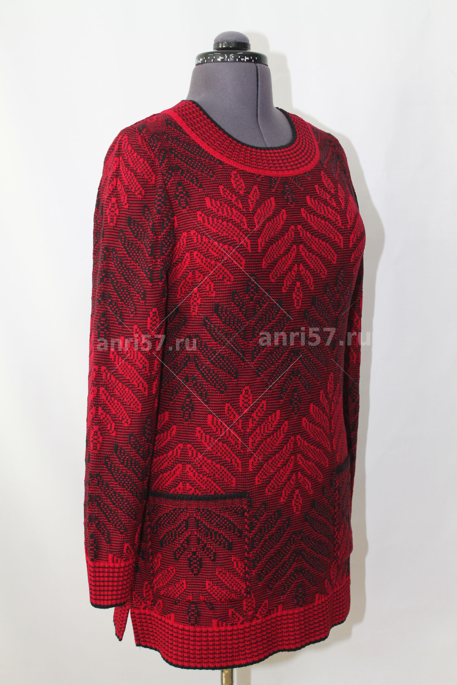 Туника полуприлегающего силуэта из жаккардового двухцветного вязаного полотна полуприлегающего силуэта. В боковых швах разрезы. Рукав втачной на "резинке". Горловина округлой формы с обтачкой.
