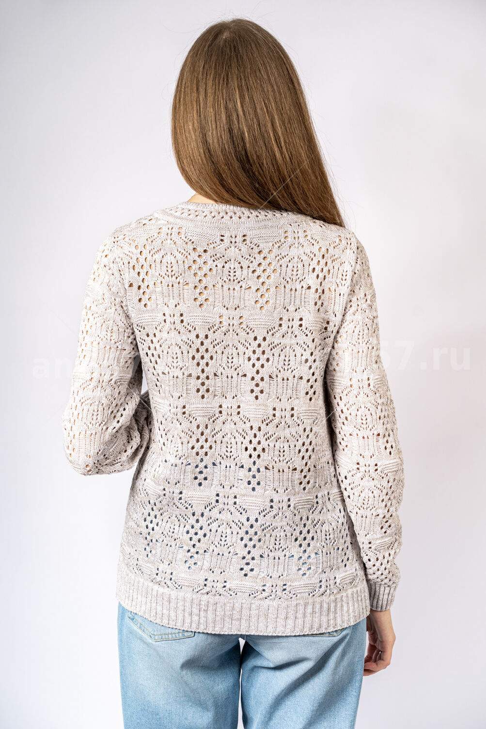 Жакет полуприлегающего силуэта из ажурного вязаного полотна с центральной застежкой на петли и пуговицы. Полочки с планками, горловина округлой формой с обтачкой. Рукав втачной, низ на "резинке". На полочках вывязанные карманы.