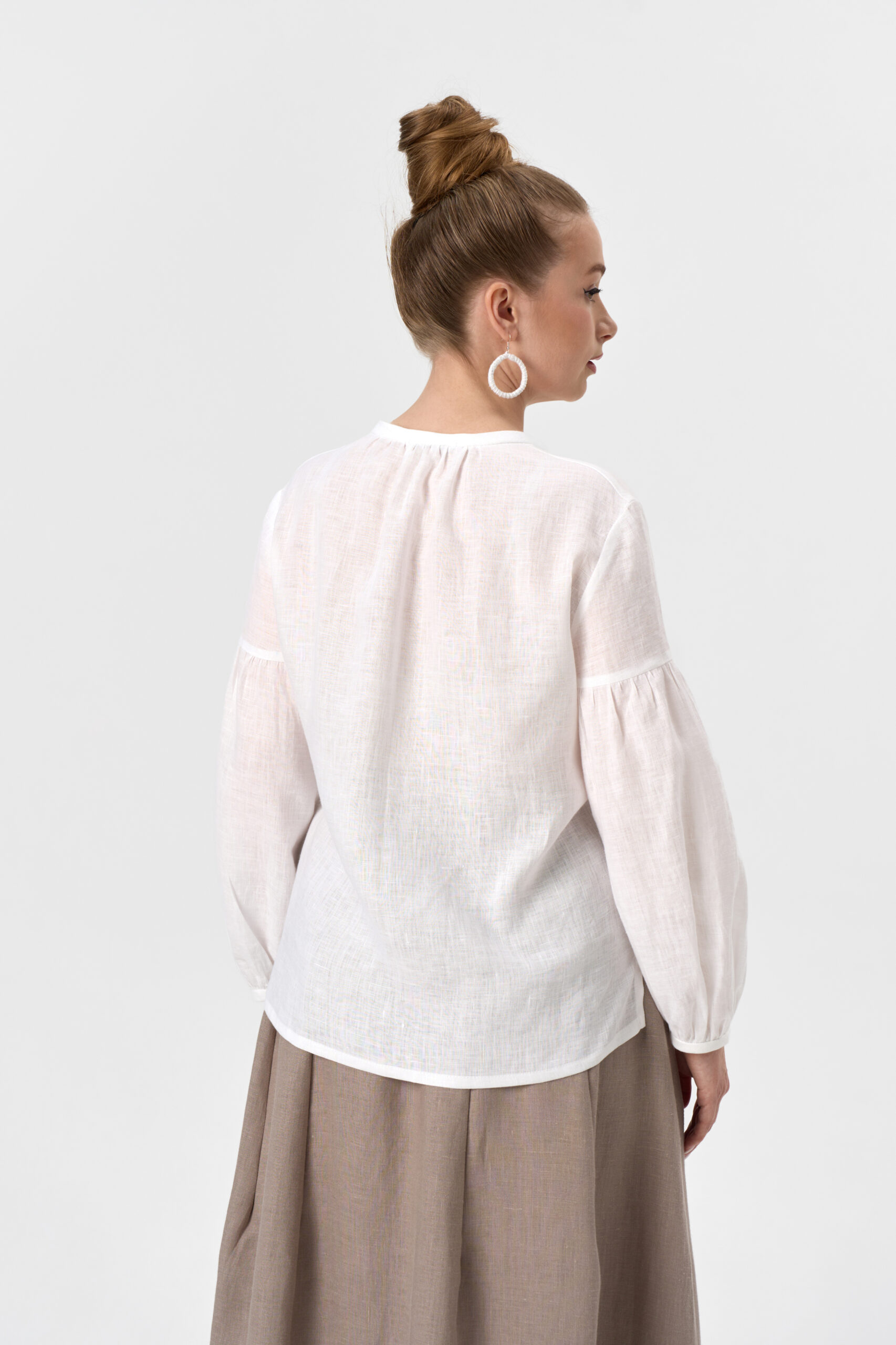 Блузка женская укороченная на кокетке. Рукав втачной длинный. Застежка центральная на пуговицы. Воротник рубашечный на стойке.