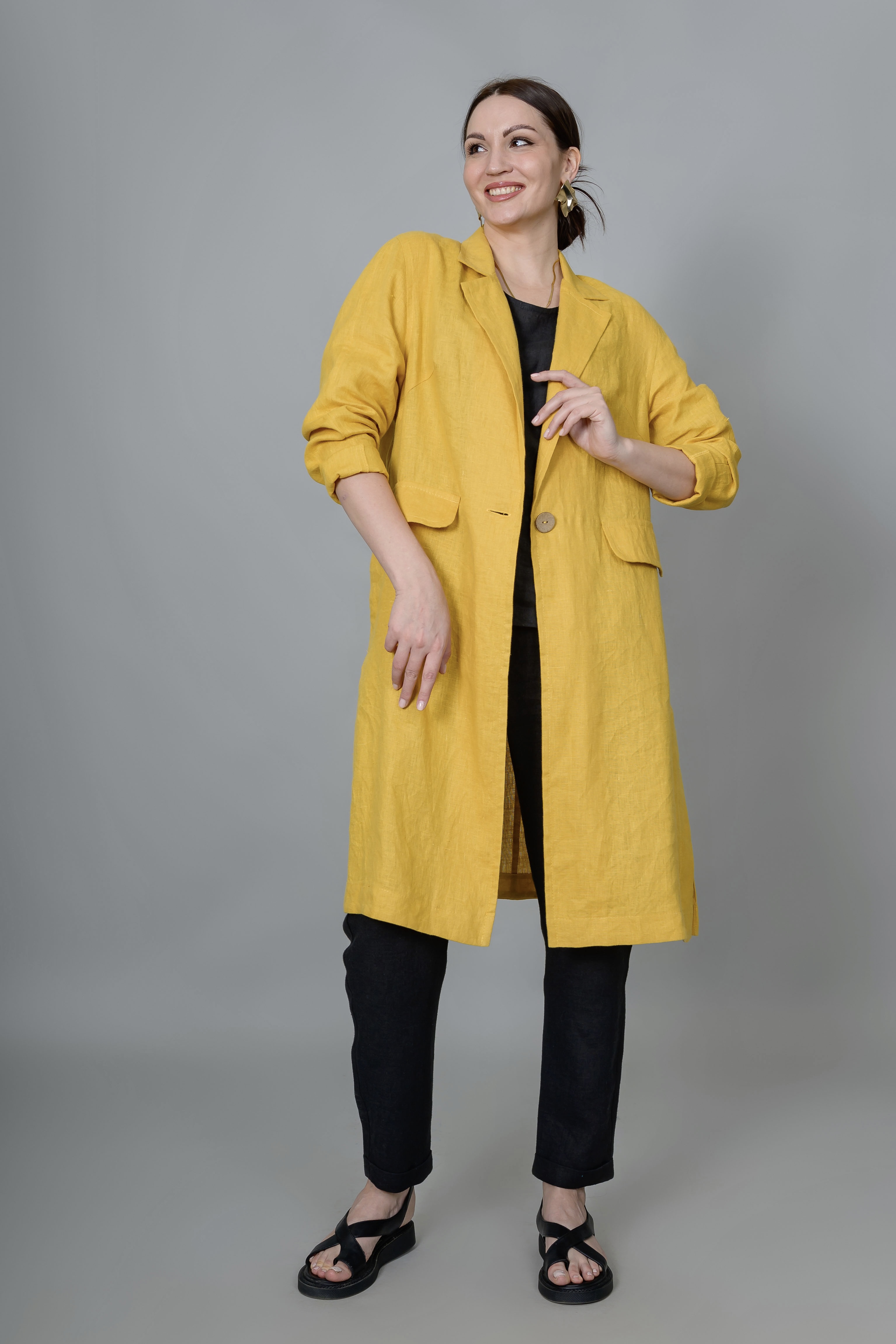 Стильный удлиненный  жакет из натурального льна для создания безупречного образа. Прямой свободный крой элегантно драпирует фигуру, деликатно скрывая нюансы в области бедер и талии, и обеспечивает безупречный вид с брюками различных силуэтных форм. По боковым швам  выполнены удобные карманы, декорированные накладными клапанами и высокие шлицы,  что добавляет функциональности и элегантности этой модели. Длина чуть ниже колена создает выигрышную вертикаль, которая визуально вытягивает силуэт, делая его стройнее и изящнее.  Модель без подкладки выполнена из плотного 100% льна, уникальные свойства которого обеспечивают комфорт в любую погоду.