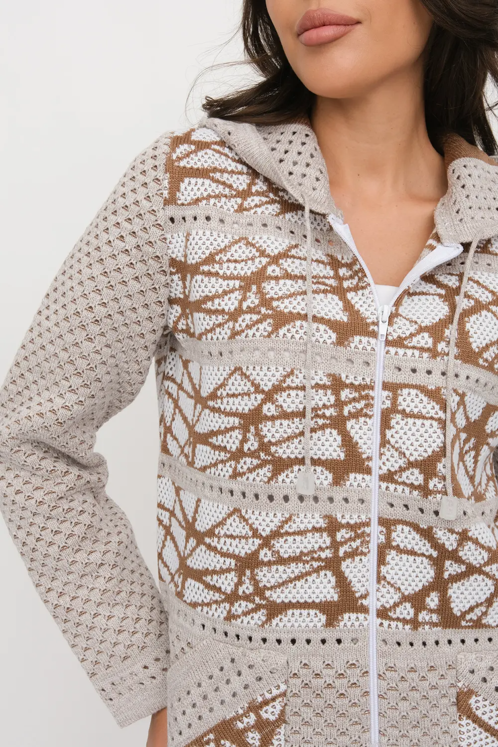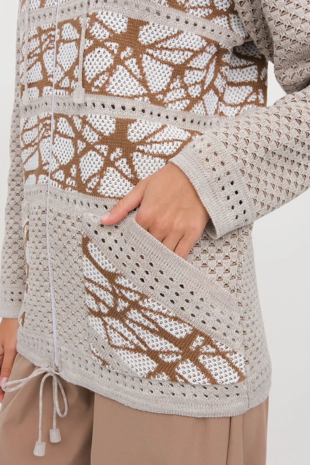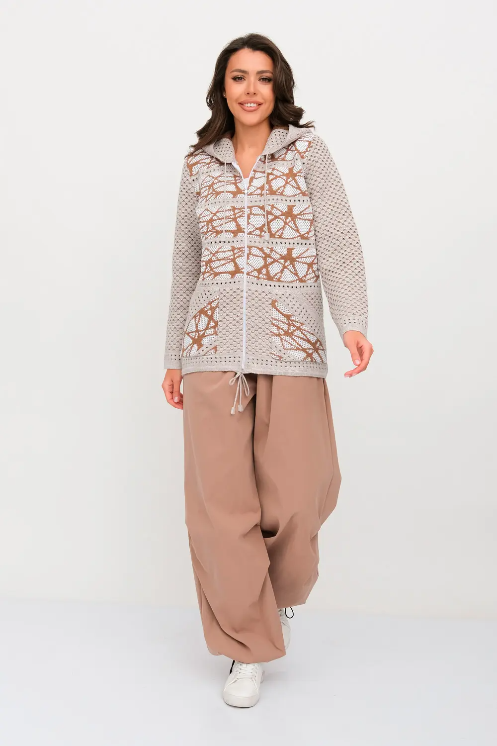Жакет женский прямого силуэта с капюшоном в спортивном стиле.  Рукава втачные длинные. Карманы накладные симметрично расположены " кенгуру".  Рисунок горизонтальные полоски выполнены жаккардово-ажурным переплетением. В капюшон и низ изделия проложен шнурок. кофе-молоч