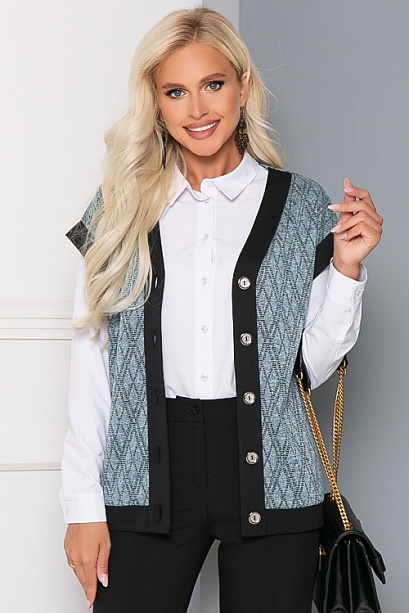 Жакет-жилет из трикотажного полотна с контрастной отделкой и центральной застежкой.