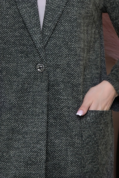 * Жакет свободного силуэта из теплого комфортного трикотажного полотна в елочку,прямого свободного силуэта .По переду центральная застежка на одну пуговицу.Воротник отложной с лацканами.По переду жакета накладные удобные карманы.