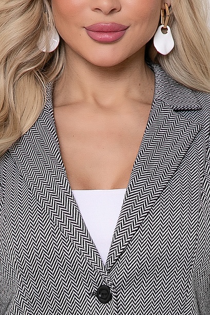 Жакет из плотного жаккардового трикотажного полотна в елочку полуприлегающего силуэта с контрастной отделкой по бокам.Воротник отложной с лацканами.По переду застежка на три пуговицы.