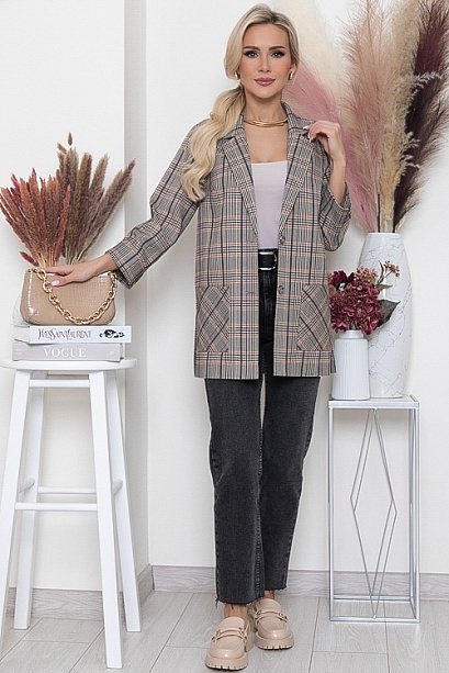 Жакет из комфортной,качественной костюмной ткани свободного силуэта,в боковых швах разрезы.Центральная застежка на две пуговицы.По переду удобные накладные карманы.