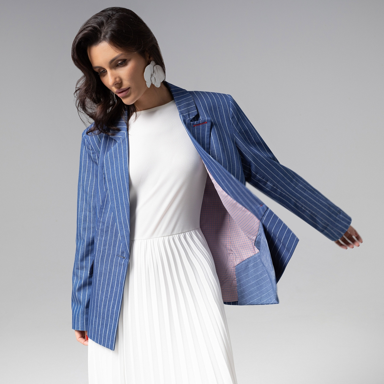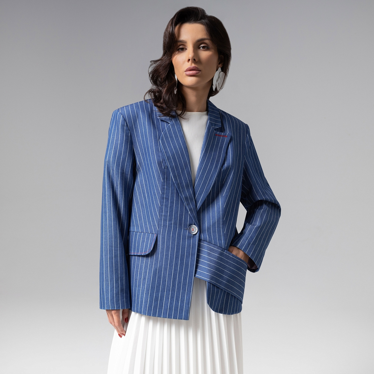 Асимметрия как искусство. Свободный силуэт с небрежной элегантностью и безупречная конструкция. Авангардный крой с намеренно смещенной линией подола изделия показывает вашу креативность. Каждый шов продуман для идеальной динамики движения. Акцентный подклад украсит вашу повседневность. Это не просто жакет – это скульптурный объект, где каждая деталь говорит о безусловном превосходстве. Жакет однобортный с лацканами свободного кроя. Изделие с карманами на подплечниках.