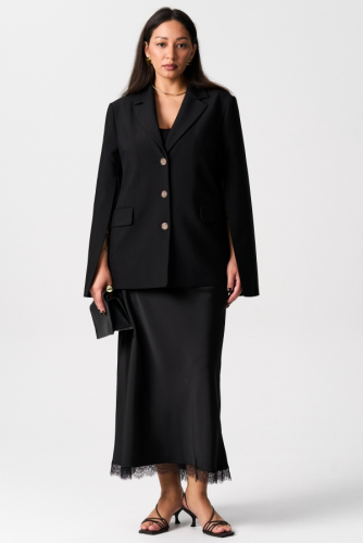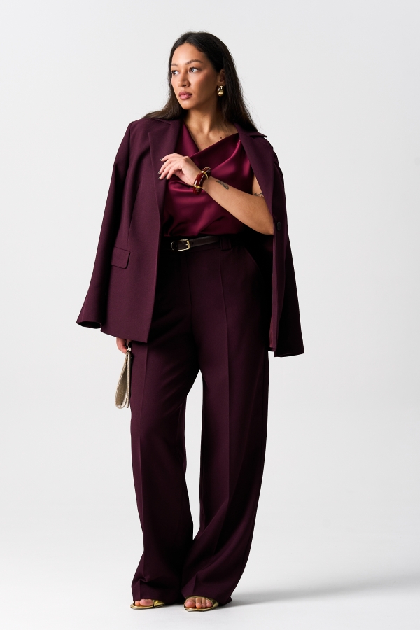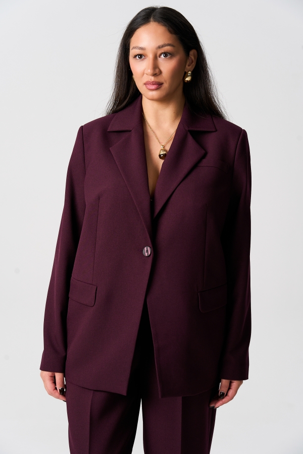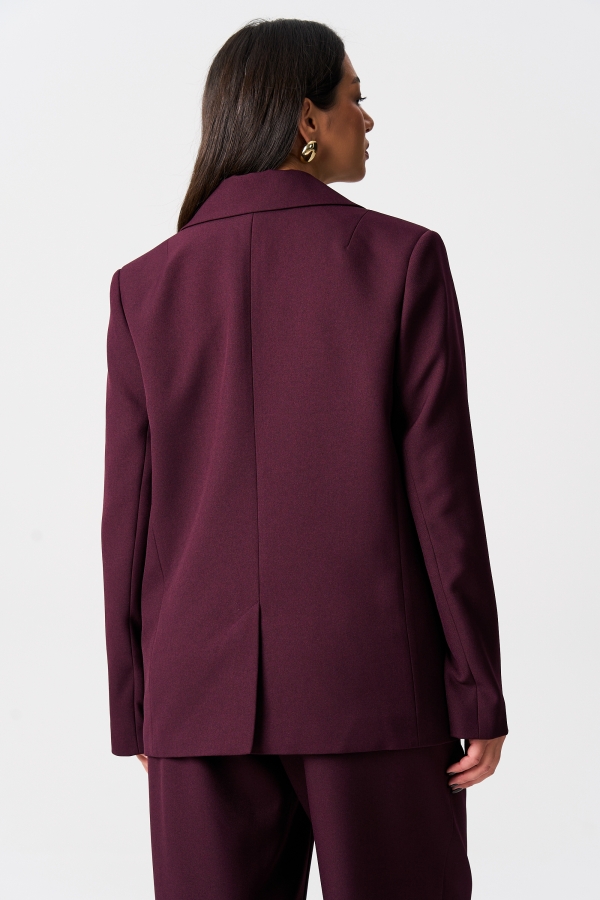 Однобортный прямой жакет среднего объема. Модель прямого силуэта с английским воротником. По переду листочка,прорезные карманы с клапанами и застежкой на петлю и пуговицу. Рукав втачной. По спинке шлица. Изделие на поливискозном подкладе.