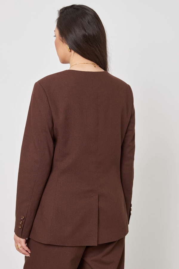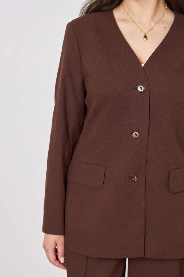 Прямой однобортный жакет прилегающего силуэта с застежкой на пуговицы и петли. По переду карманы с клапаном, шлица на спинке и рукавах.