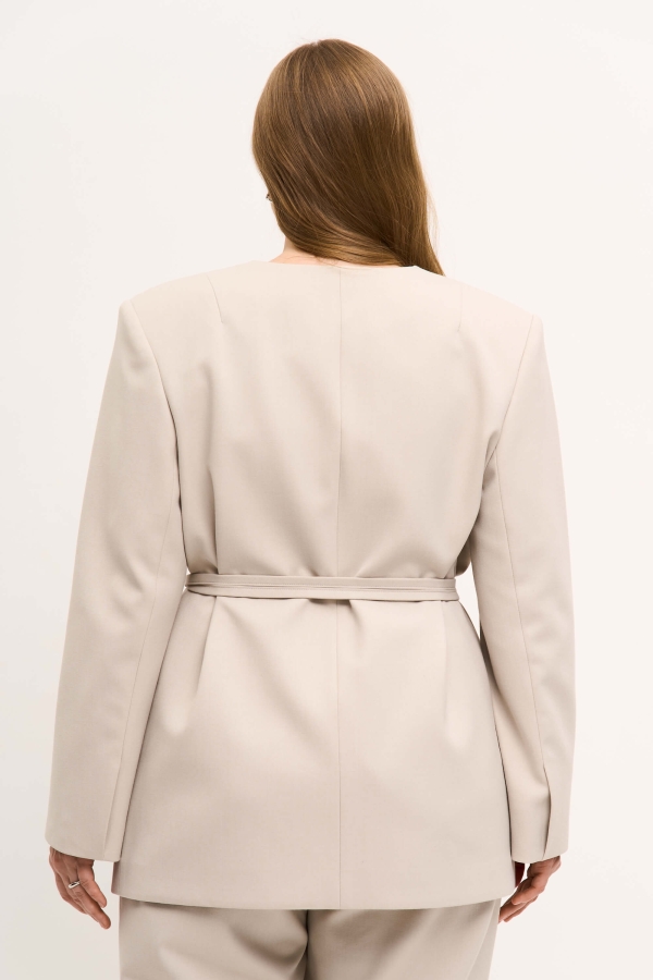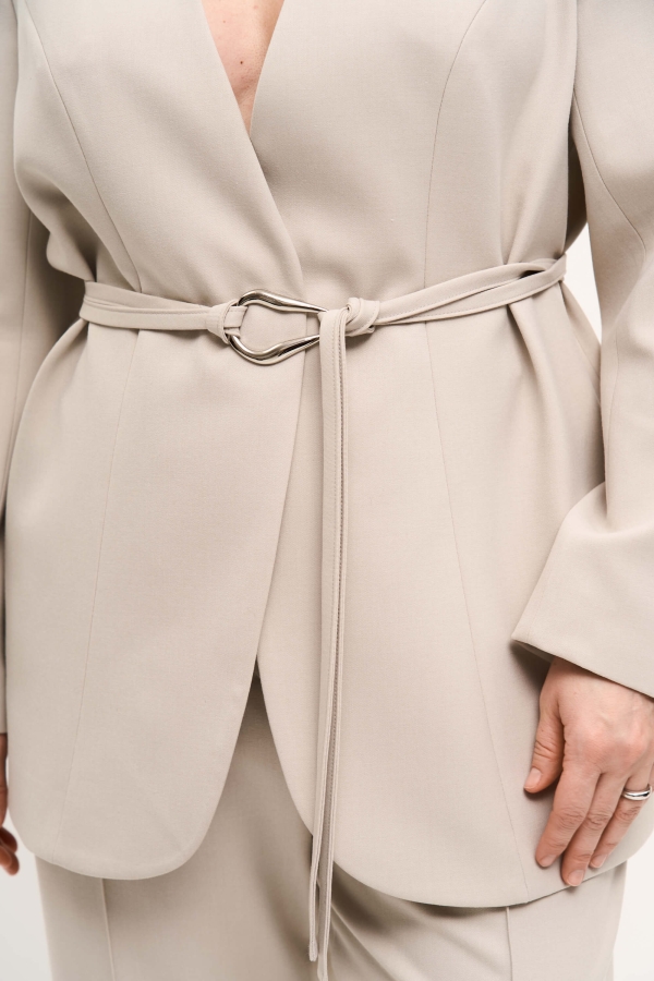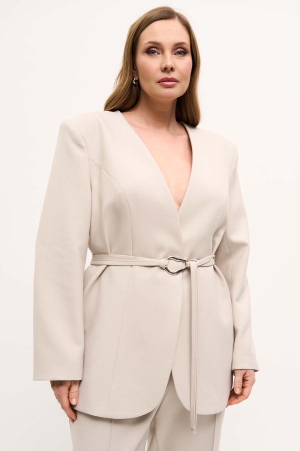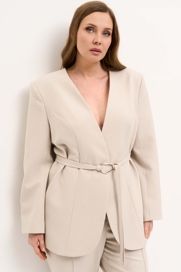Элегантный жакет из костюмного полотна. Модель прямого силуэта. По переду рельефы, вытягивающие силуэт, застежка на внутреннюю пуговицу. Рукав втачной. В комплекте пояс с металлической пряжкой. Изделие на поливискозном подкладе.