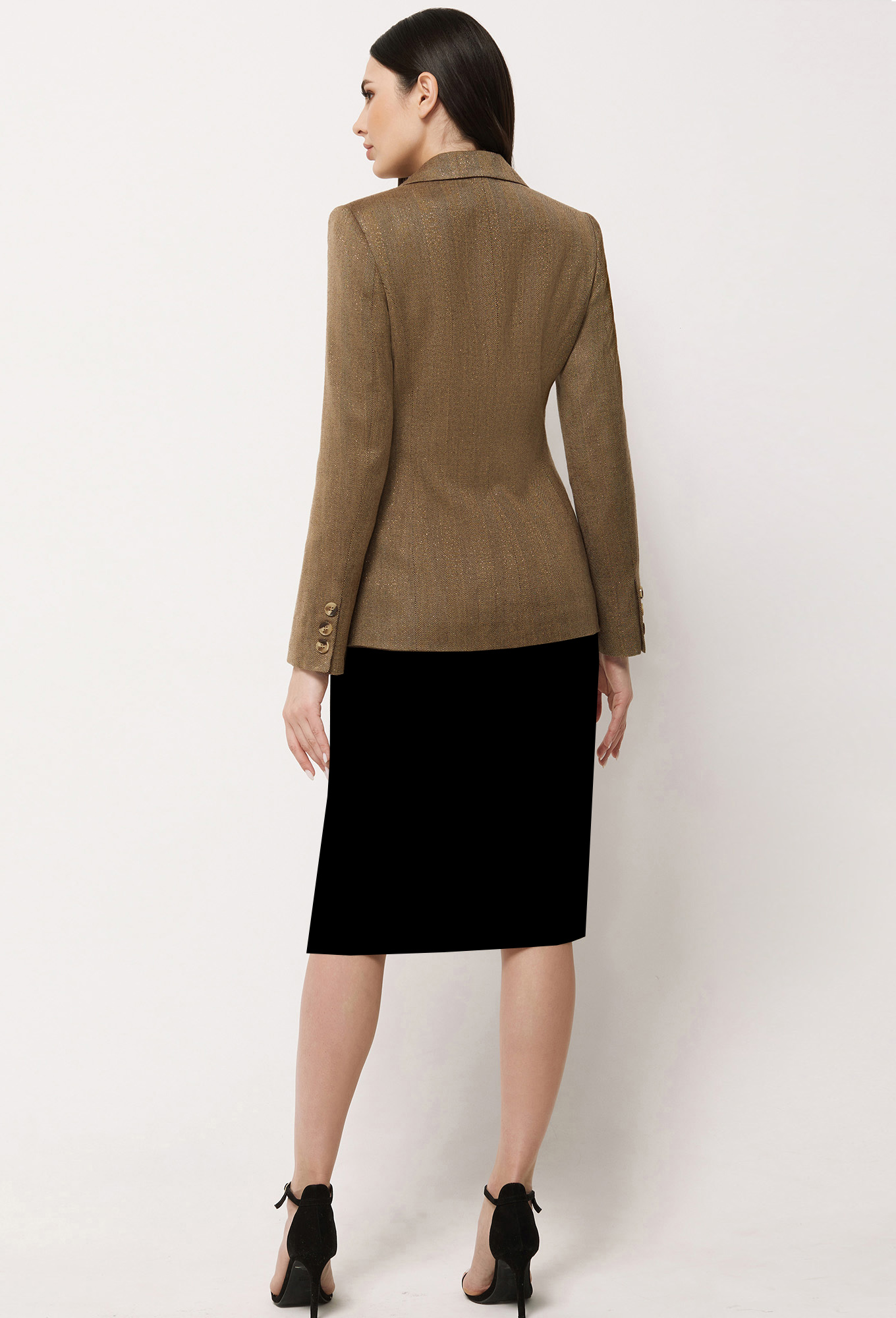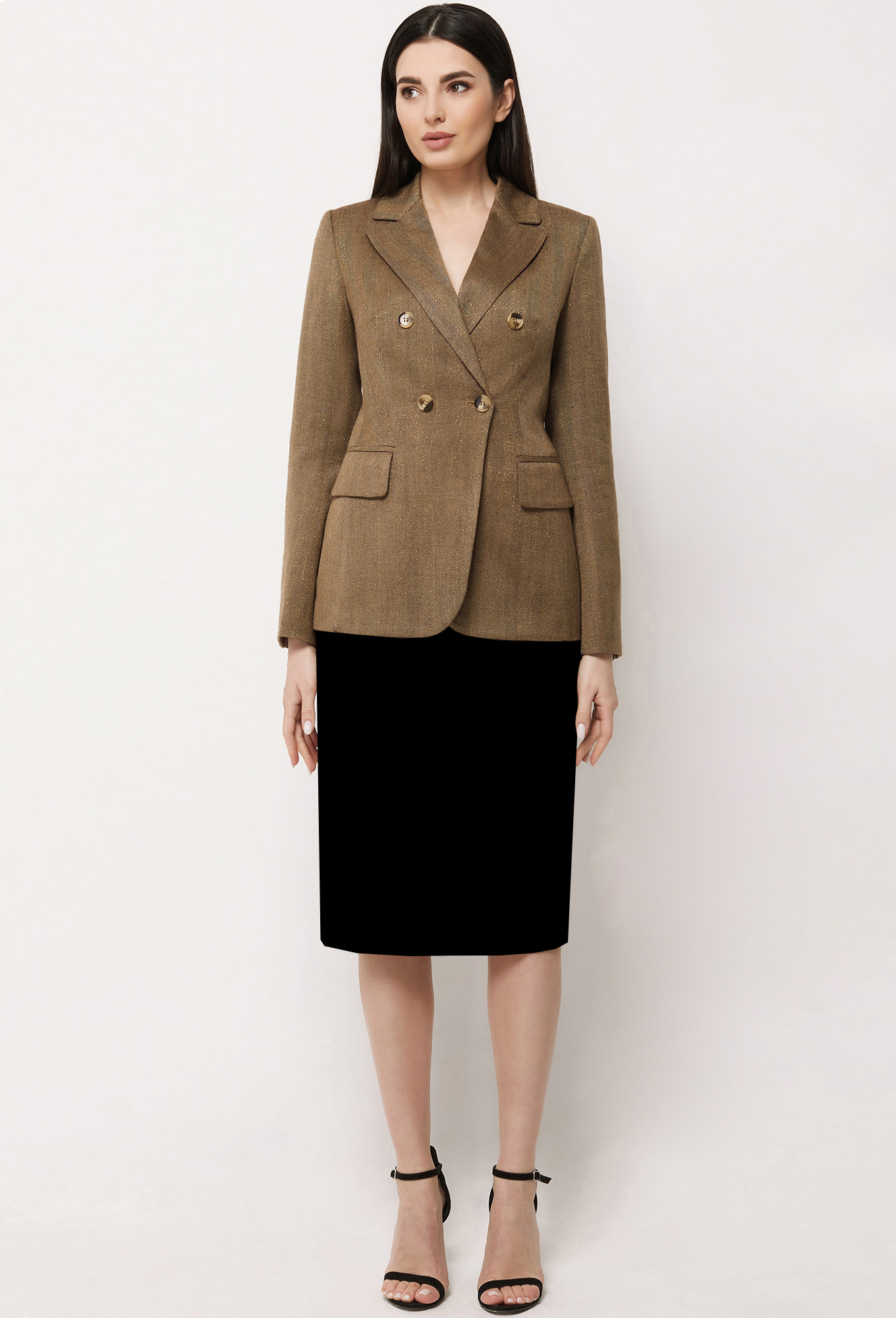 Модель: Базалини 3864 коричневый ..показатьРост: 164 см (девушка на фото 170см) Сезон: Осень-Зима Тип ткани: 64% Полиэстер, 32% Вискоза, 2% Эластан, 2% Метал. нитьДвубортный жакет с застёжкой на петли. Спинка со средним швом. Рукава втачные двухшовные со шлицами и декоративными пуговицами. Воротник отложной с лацканами. Жакет на подкладке с плечевыми накладками.