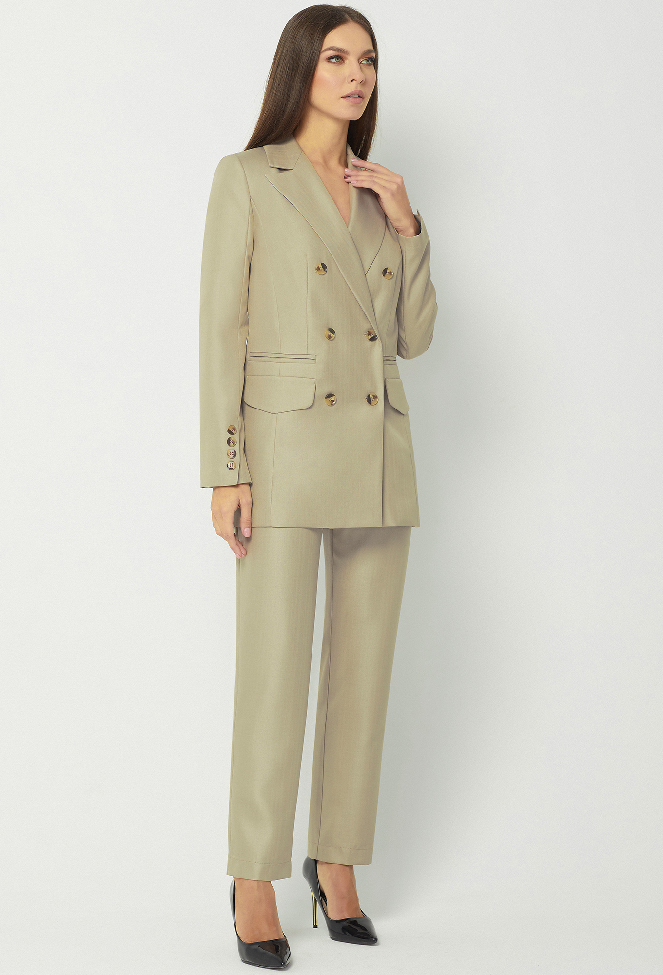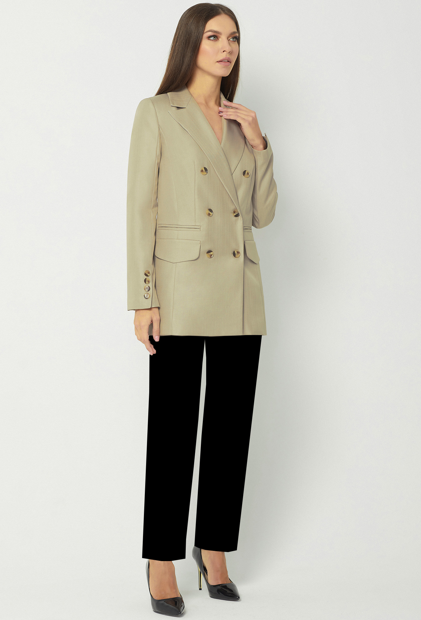 Модель: Базалини 3932 песочный Ро..показатьст: 164 см (девушка на фото 170см) Сезон: круглогодичный Тип ткани: Полиэстер- 65%, Вискоза- 32% , Эластан- 3%Двубортный удлинённый жакет с застёжкой на петли-пуговицы. Перед с двумя карманами-обманками с рамками и двумя прорезными карманами с клапанами и листочками. Рукава втачные двухшовные, передние швы со шлицами и отделочными пуговицами. Воротник отложной с широкими лацканами. На подкладке
