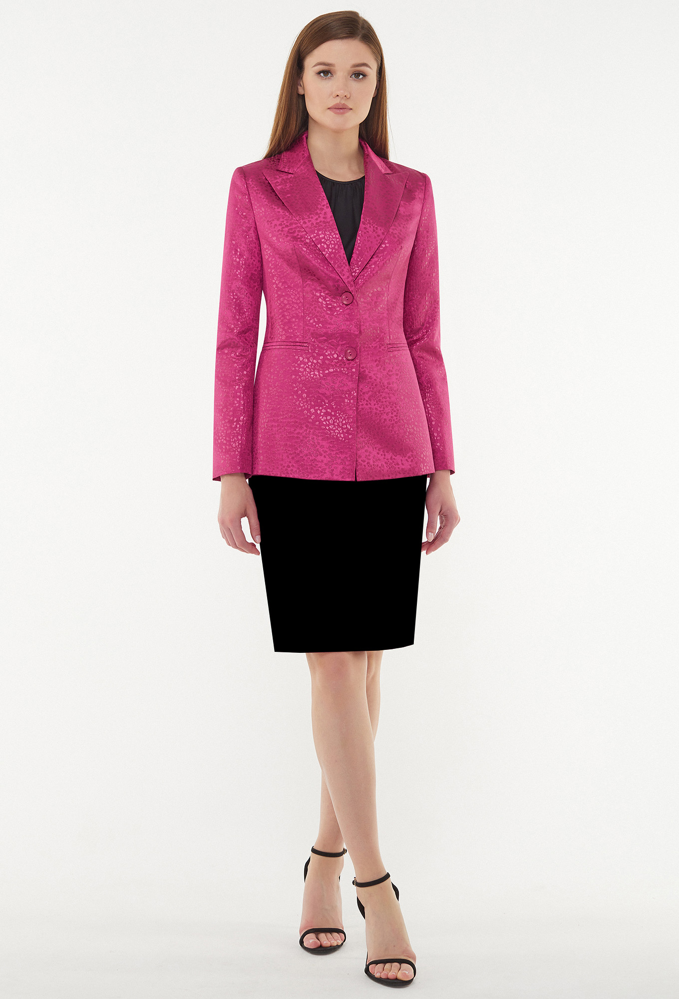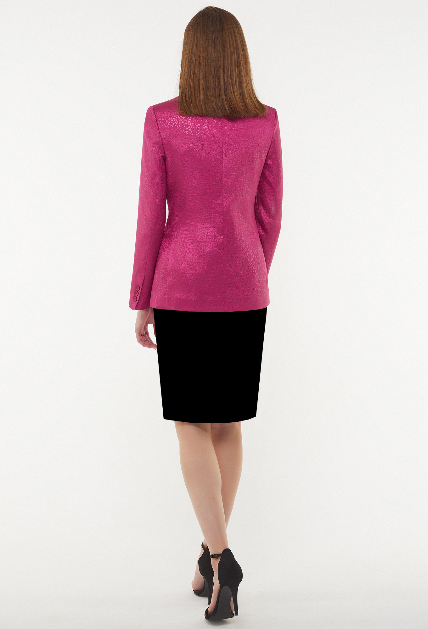 Модель: Базалини 4510 фуксия Рост..показать: 164 см (девушка на фото 170см) Сезон: Круглогодичный Тип ткани: 75% полиэстер, 23% вискоза, 2% эластанСтильный однобортный жакет полуприлегающего силуэта. Перед с глубоким V-образным вырезом горловины, с застёжкой на две петли-пуговицы и с двумя функциональными карманами с рамками. Рукава втачные двушовные с декоративными шлицами и отделочными пуговицами, на подкладке.