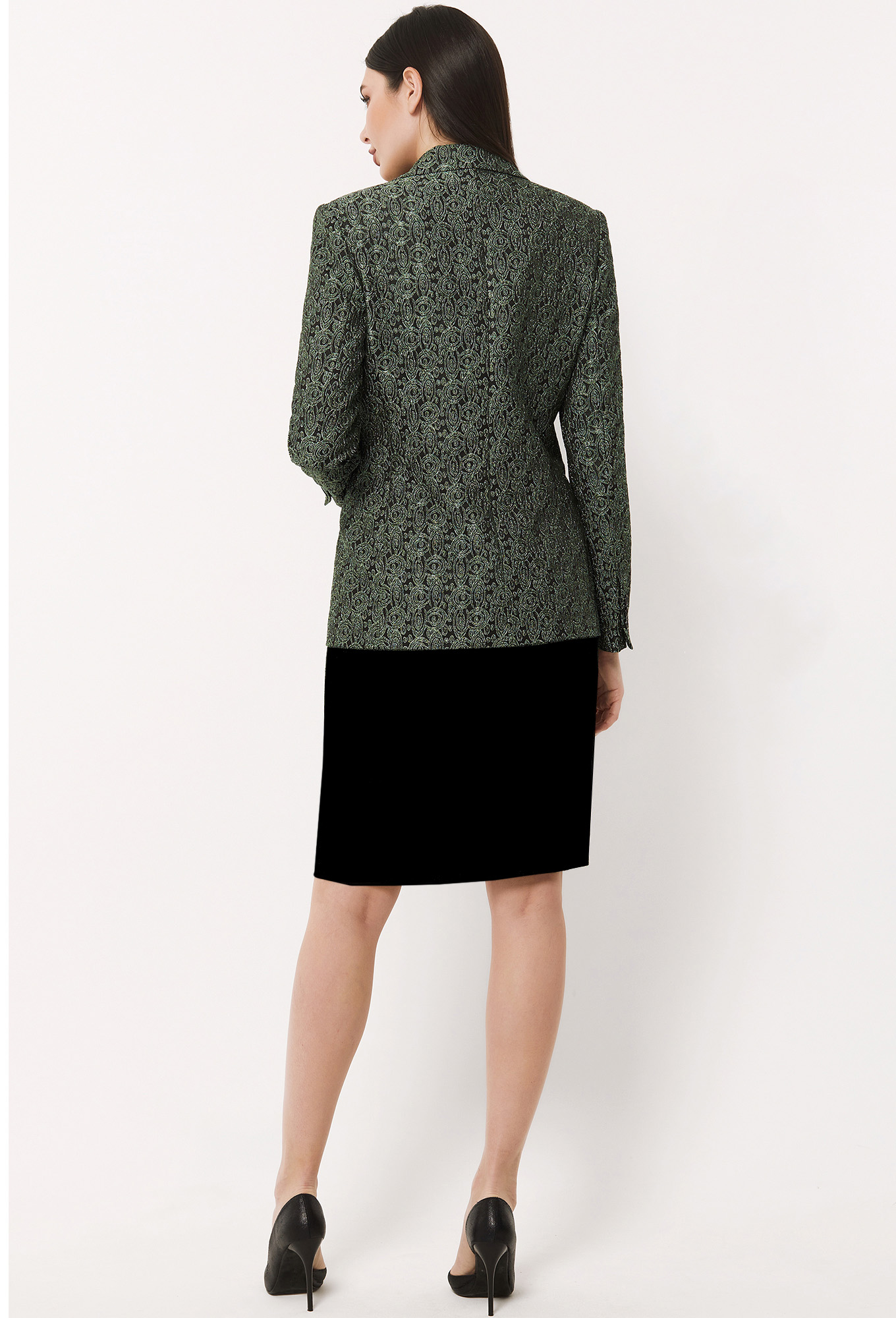Модель: Базалини 4510 зелено-черный <..показатьli>Рост: 164 см (девушка на фото 170см) Сезон: круглогодичный Тип ткани: 63% полиэстер, 34% вискоза, 3% эластанСтильный однобортный жакет полуприлегающего силуэта, выполненный из жаккардовой ткани с интересным рисунком, будет эффектно смотреться как и с однотонными вещами, так и с вещами в одной гамме. Перед с глубоким V-образным вырезом горловины, с застёжкой на две петли-пуговицы и с двумя функциональными карманами с рамками. Рукава втачные двушовные с декоративными шлицами и отделочными пуговицами. На подкладке.