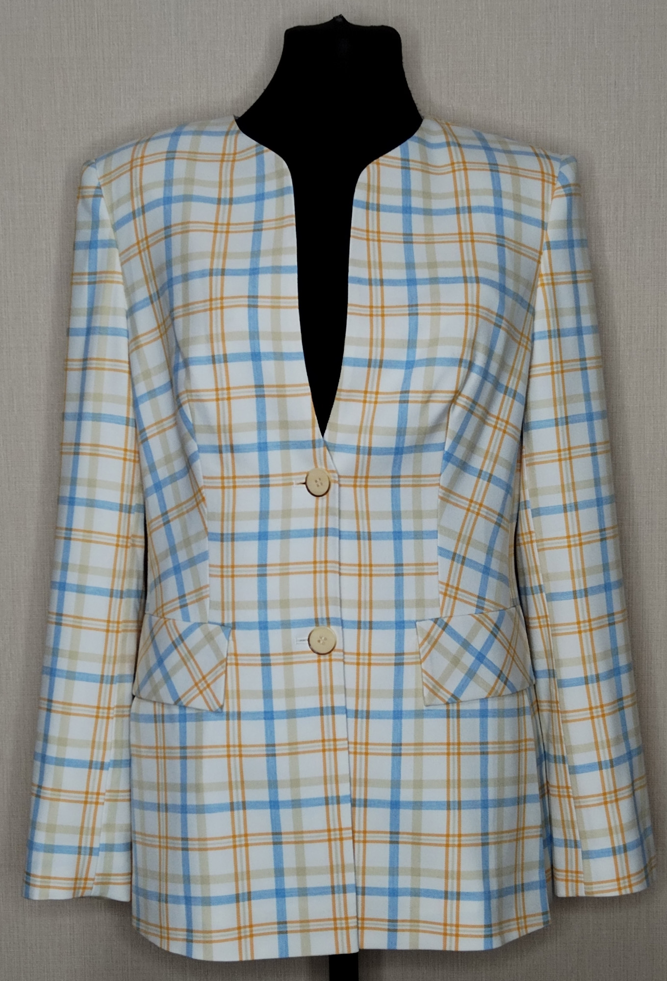 Модель: Базалини 4614 молочный голубая кле..показатьтка Рост: 164 см (девушка на фото 170см) Сезон: Весна-Лето Тип ткани: УточняетсяСтильный однобортный жакет полуприлегающего силуэта, выглядит эффектно, но ненавязчиво. Перед с глубоким фигурным V-образным вырезом горловины, с застёжкой на петли-пуговицы и с фигурной линией борта. Рукава втачные с отделочными пуговицами. Воротник-стойка. На подкладке.тка