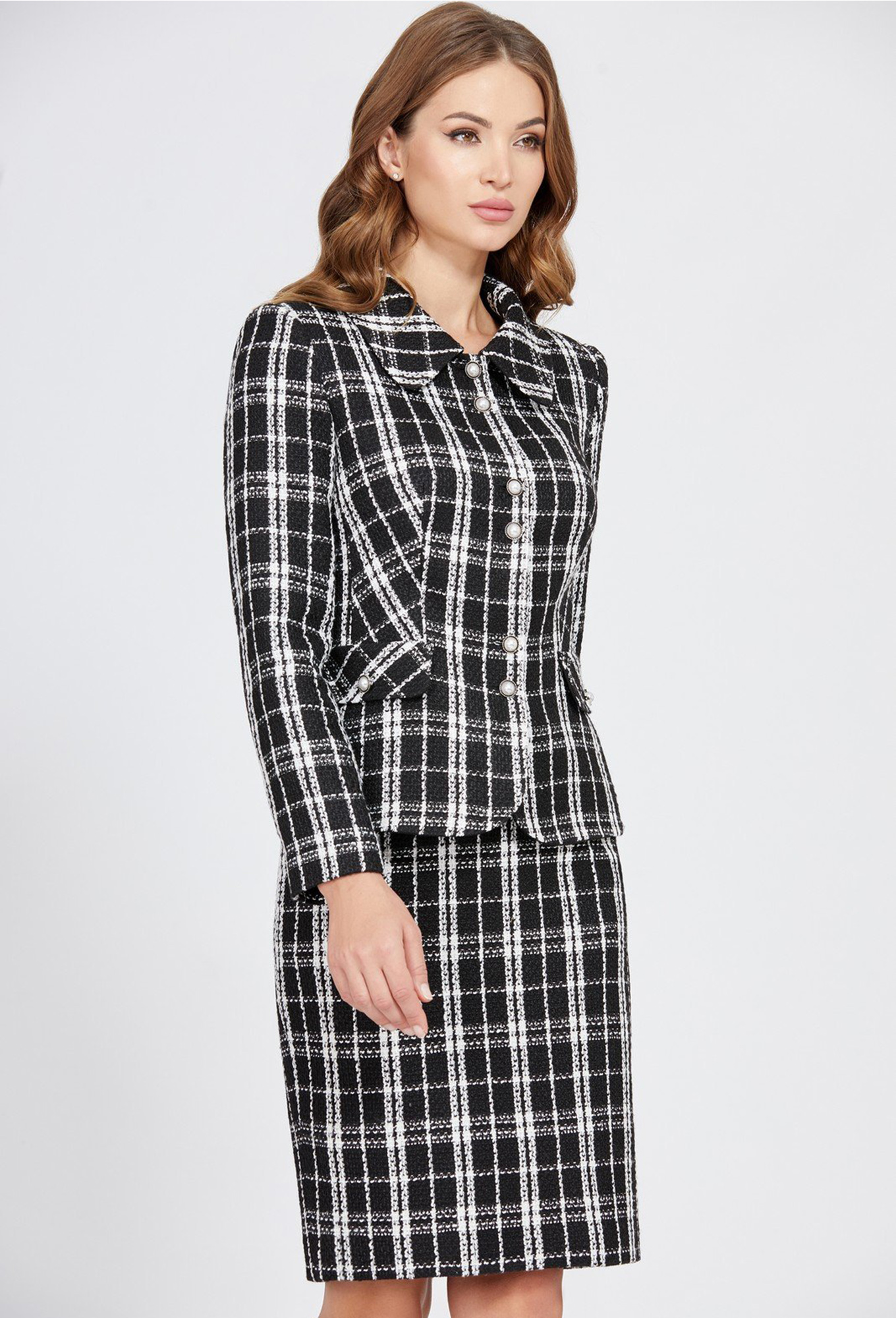 Модель: Базалини 4750 чёрный клетка <..показатьli>Рост: 164 см (девушка на фото 170см) Сезон: Круглогодичный Тип ткани: Полиэстер 65%, Вискоза 30%, Акрил 5%Изысканный жакет из мягкого фактурного твида в бело-черную клетку станет отличным дополнением к гардеробу современной женщины. Эта полуприлегающая модель оснащена отложным воротником и украшена декоративными клапанами, придающими образу законченность. Эффектные контрастные пуговицы вносят праздничное настроение и придают образу особую изысканность. Длинные двухшовные втачные рукава и качественная подкладка обеспечивают комфорт и превосходное качество изделия.