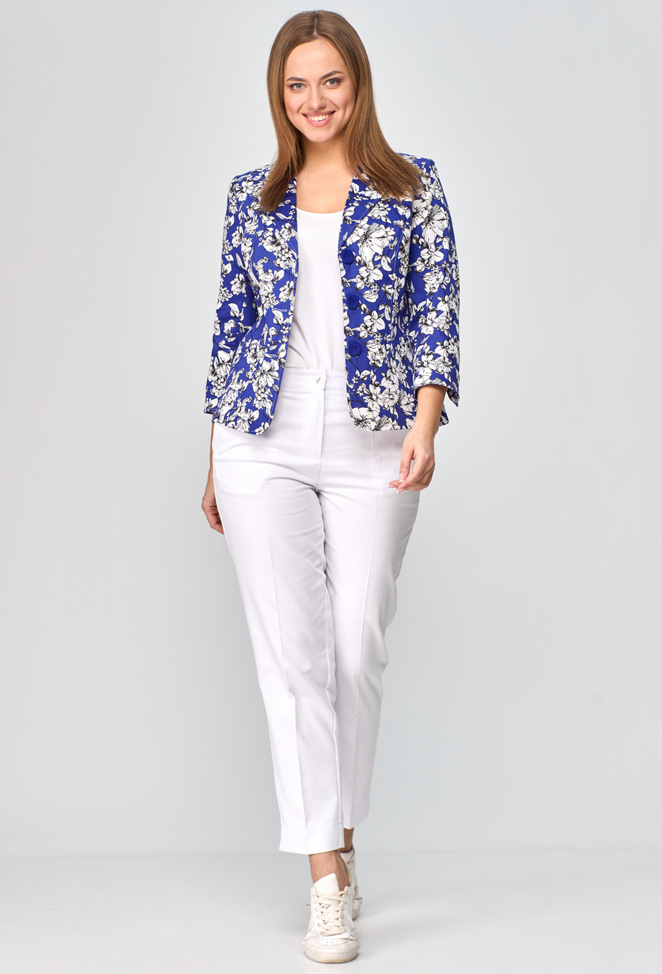Модель: БЕЛЭЛЬСТИЛЬ 203 синий черно-белые ..показатьцветы Рост: 164 см (девушка на фото ростом 170см) Сезон: Круглогодичный Тип ткани: хлопок 97%, спандекс 3%Жакет женский укороченный, полуприлегающего силуэта с центральной бортовой застежкой на пуговицы до линии перегиба лацкана. Спереди рельефные швы от плечевого шва,отрезной бочок и накладной карман. Спинка со средним швом и рельефами от плечевого шва. Рукав втачной, двухшовный, 3/4. Воротник пиджачного типа. Жакет на х/б подкладке.  Фурнитура может отличаться от студийного фото.