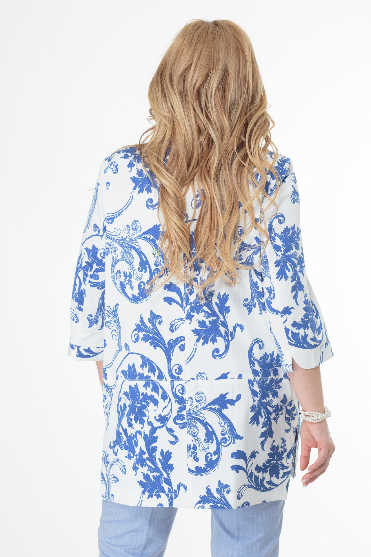 Модель: БЕЛЭЛЬСТИЛЬ 756 белый синие вензел..показатья Рост: 164 см (девушка на фото ростом 170см) Сезон: Круглогодичный Тип ткани: хлопок 97%, спандекс 3%Женский жакет-блуза, прямого силуэта, из джинсовой ткани. Горловина округлой формы, застежка центральная на притачную планку, застегивается на металлические кнопки. В отрезной части переда обработаны карманы. Спинка со средним швом и отрезной частью. Низ фигурный. В боковых швах разрезы. Рукав втачной, двухшовный, с притачной манжетой, 3/4. Изделие без подкладки. Фурнитура может отличаться от студийного фото.