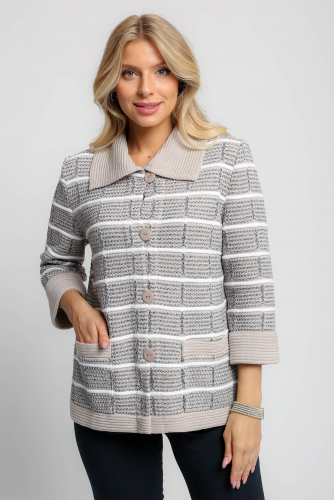 Вязаный женский жакет свободного силуэта с рубашечным отложным воротником.  Рукав втачной длиной 7/8 с отворотом.  По бокам два накладных кармана с листочкой. Жакет застегивается на пуговицы с навесной петлей. Изделие выполнено жаккардовым переплетением  образующим валики. пудра