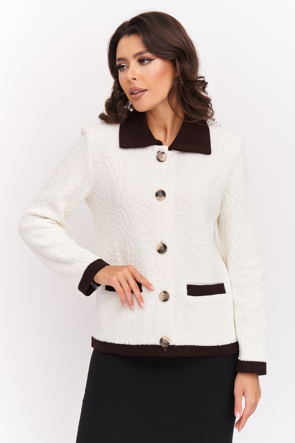 Жакет женский вязаный прямого силуэта с отложным воротником. Трикотажный пиджак выполнен из высококачественной пряжи с составом 30% хлопок 70% ПАН. Кофта на пуговицах имеет длинные втачные рукава и два прорезных кармана с листочкой. Классический жакет застегивается на пуговицы по всей длине. Пиджак оформлен классическим отложным воротником контрастного цвета. Длина изделия 59 см, длина рукава 60 см. Нарядный жакет выполнен жаккардовым переплетением образующим оригинальный рельефный рисунок, имитирующий ажур. Праздничный пиджак прямого силуэта подойдет для любого типа фигуры и составит оригинальный, модный и женственный образ абсолютно с любым низом: юбка, брюки, джинсы. молочный