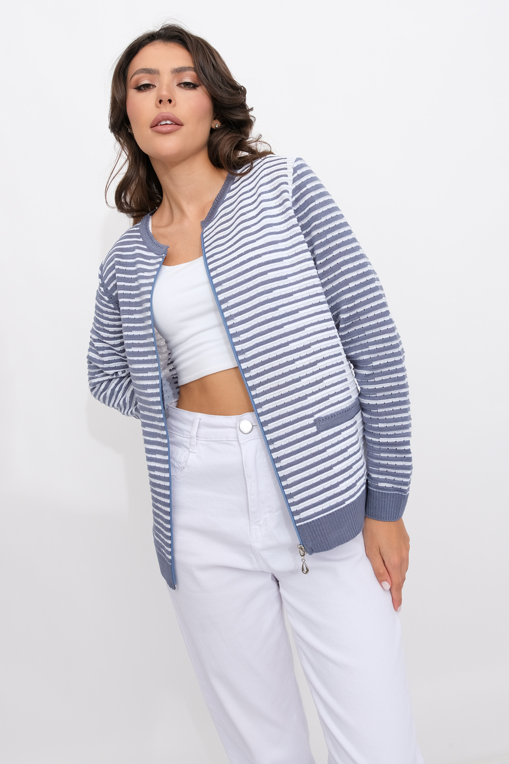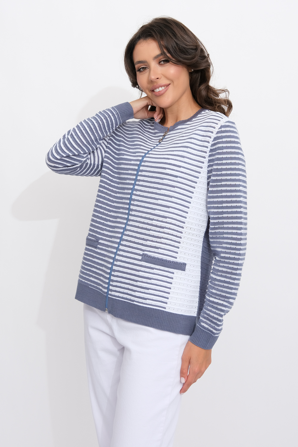 Женский вязаный жакет полуприлегающего силуэта на молнии. Рукава втачные, длинные. Жакет выполнен из качественной пряжи с составом 30% хлопок 70% ПАН. Модель имеет функциональные прорезные карманы с листочкой. Жакет выполнен переплетением, образующим валики, за счет чего имеет комфортную посадку по фигуре и эффектный внешний вид. Легкий, яркий, эффектный жакет поддержит и деловой образ, и праздничное настроение. Отлично сочетается с любым низом в комплекте. Модель классическая, праздничная и повседневная, абсолютно на любой случай в жизни. джинс