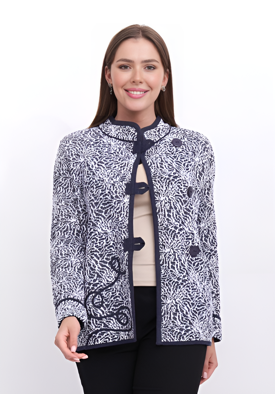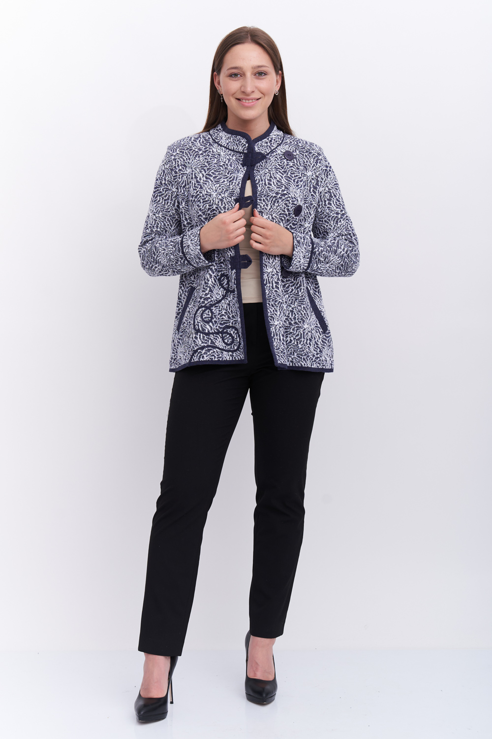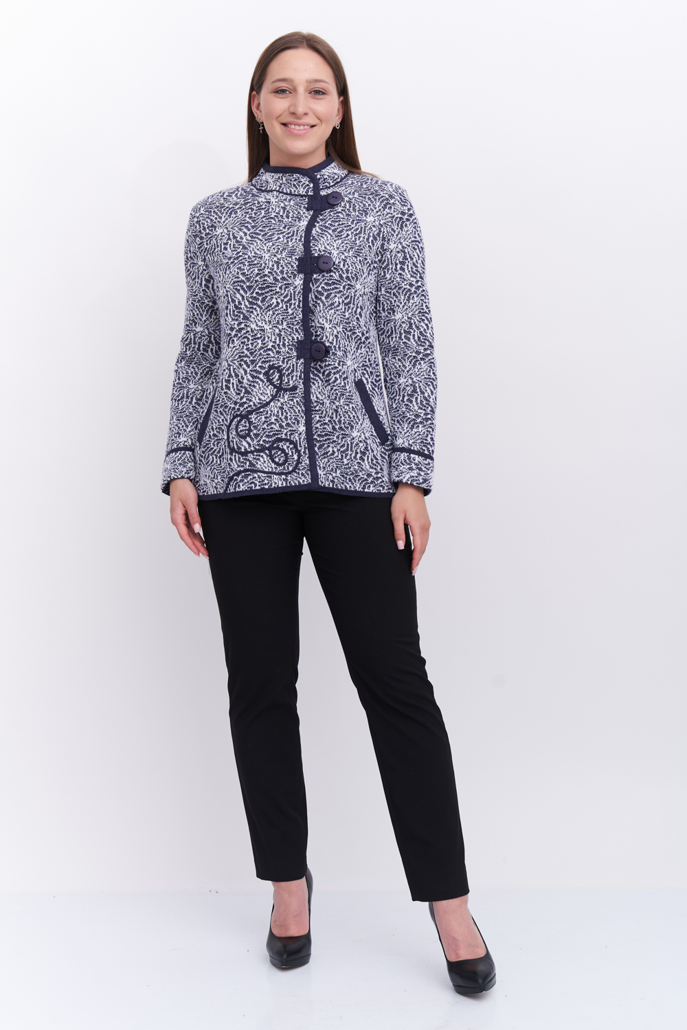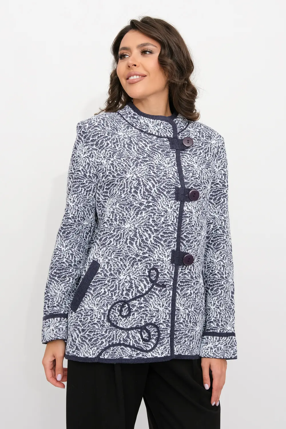 Вязаный женский жакет свободнного силуэта с воротником-стойкой.  Рукава втачные длинные с отворотом. Жакет застегивается на пуговицы и воздушные петли.  Два боковых прорезных кармана с листочкой.  Жакет выполнен жаккардовым структурным переплетением.  На правой полочке внизу расположена декоративная аппликация. джинс