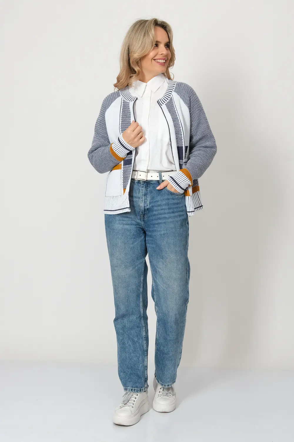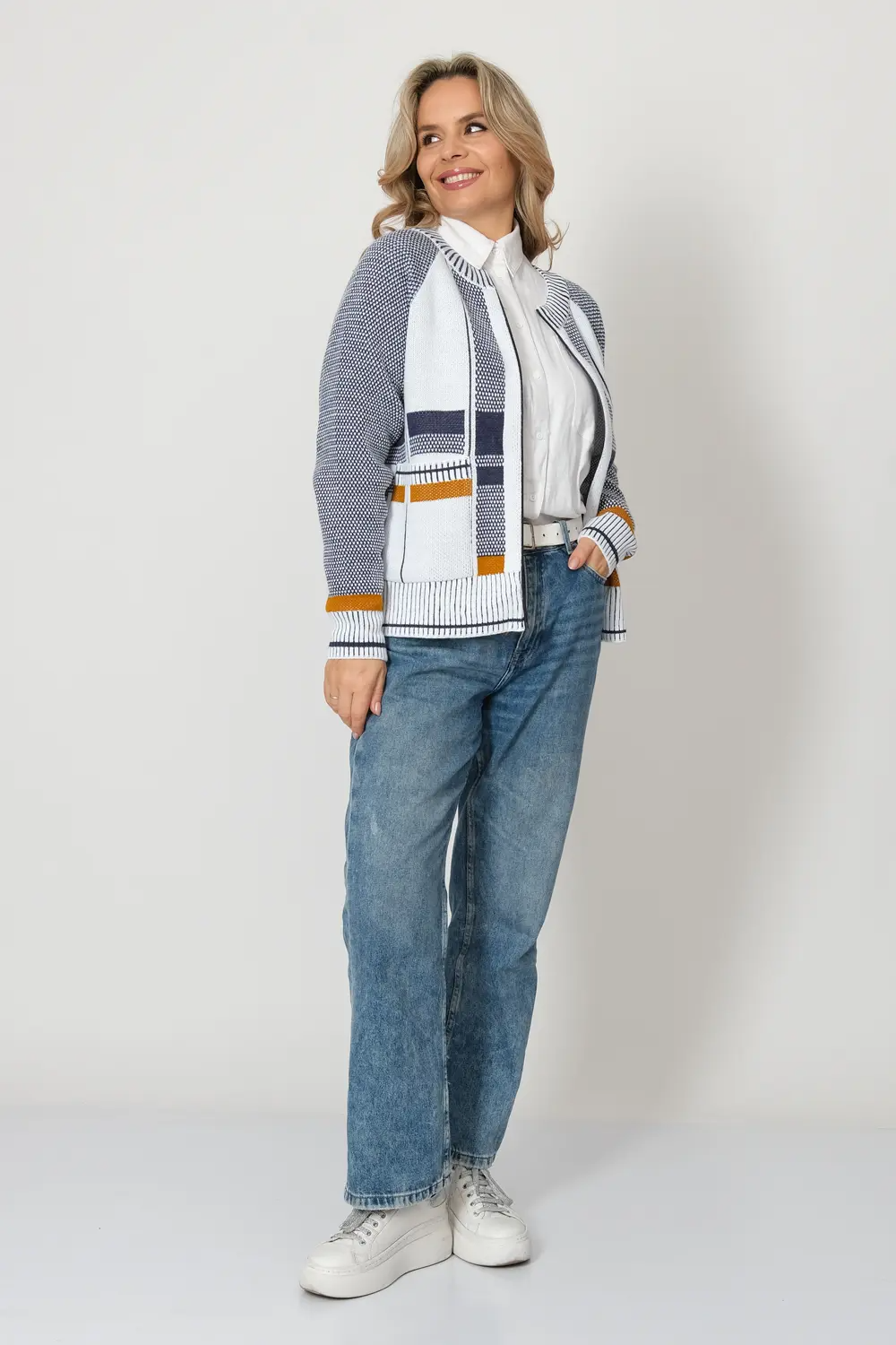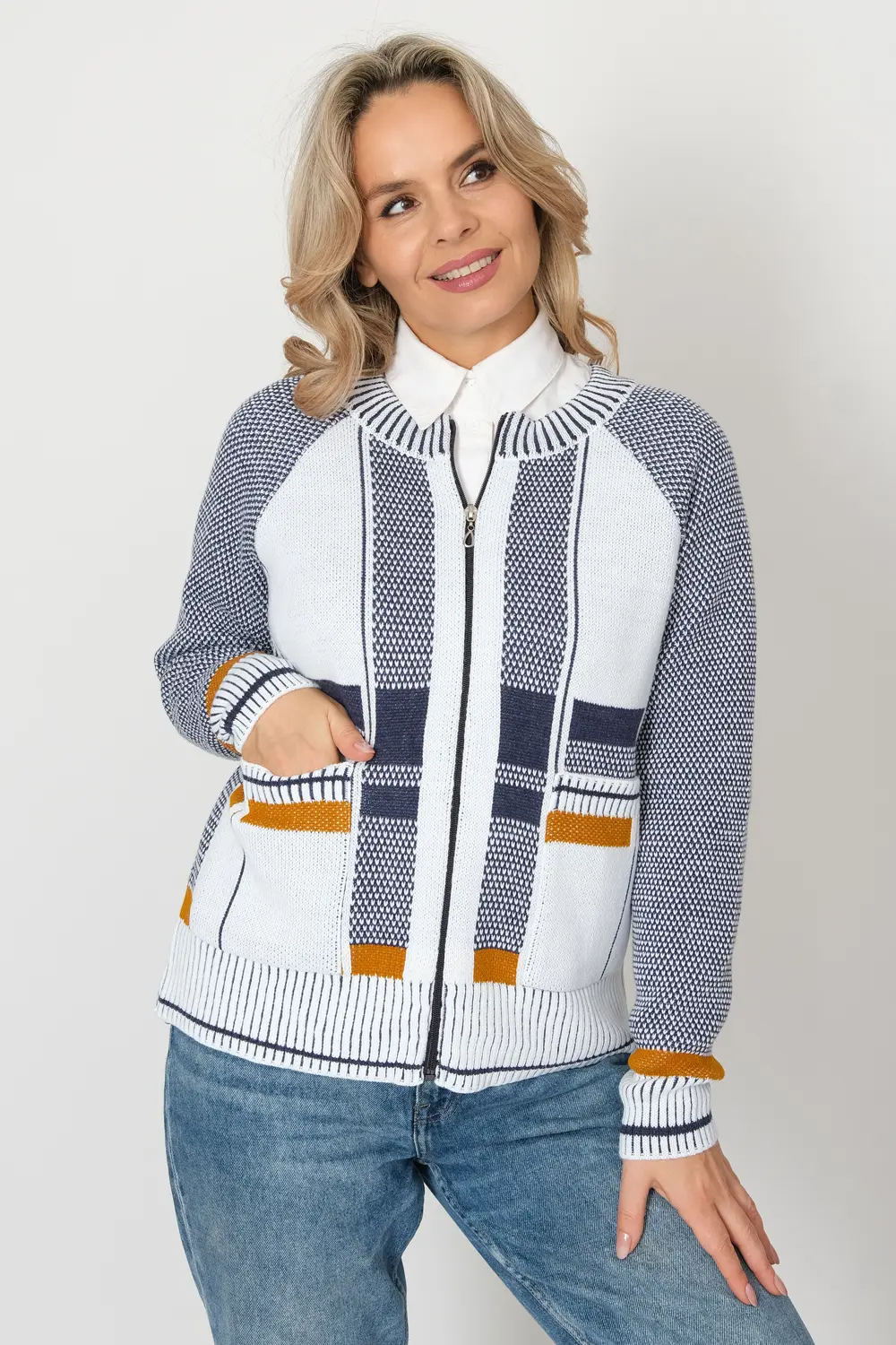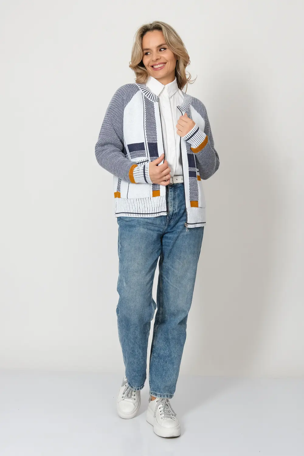 Женский вязаный жакет в спортивном стиле на молнии. Рукав-реглан длинный. Жакет выполнен из качественной пряжи с составом 30% шерсть 70% ПАН Модель имеет функциональные накладные карманы с листочкой. Жакет выполнен жаккардовым переплетением с актуальным геометрическим рисунком.  Отлично сочетается с любым низом в комплекте. джинс