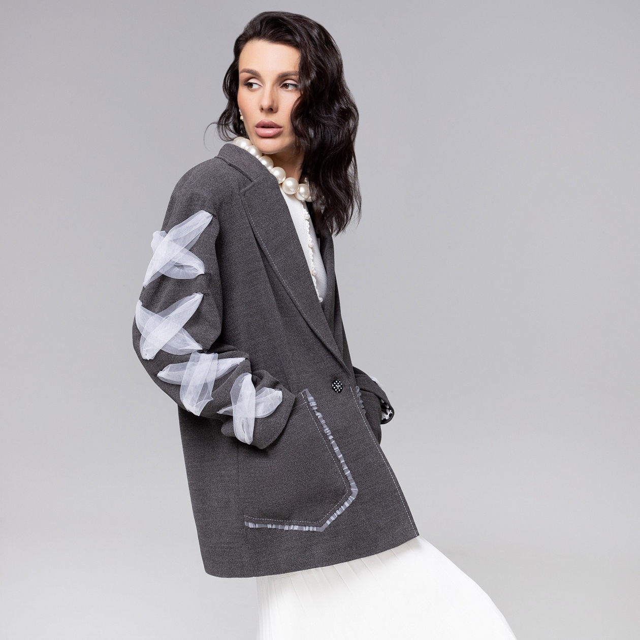 Жакет ЧАРУТТИ из коллекции PREMIUM свободного кроя с акцентными лентами на рукавах представляет собой воплощение новаторского дизайна. Художественные детали гармонично сочетаются с функциональностью. Креативный подход проявляется в игре фактур и динамике лент, которые добавляют образу авангардную выразительность. В самом деле, совершенная модель.