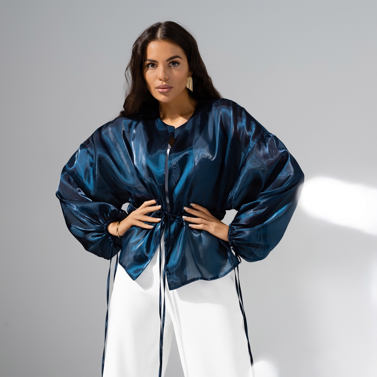 Жакет «Вершина восхищения (blue)» из органзы — это не просто элемент гардероба, это воплощение элегантности и стиля. Когда вы наденете этот дизайнерский шедевр, вы почувствуете, как внимание окружающих приковано к вам. Полупрозрачная ткань органза, из которой выполнен жакет, добавляет образу воздушности и лёгкости, а объёмные рукава с длинными завязками на манжетах подчеркивают вашу индивидуальность. Этот женский жакет станет отличным выбором для тех, кто стремится выглядеть модно и привлекательно в любой ситуации. Его универсальность позволяет сочетать его как с повседневной одеждой, так и с вечерними нарядами, делая вас звездой любого мероприятия.