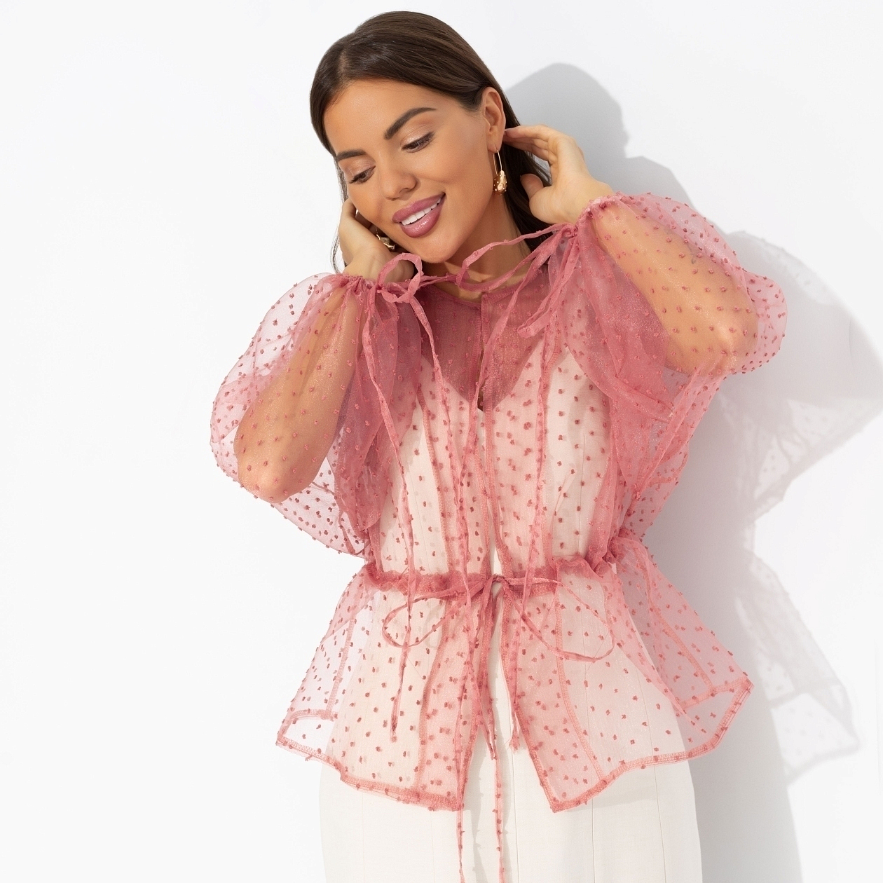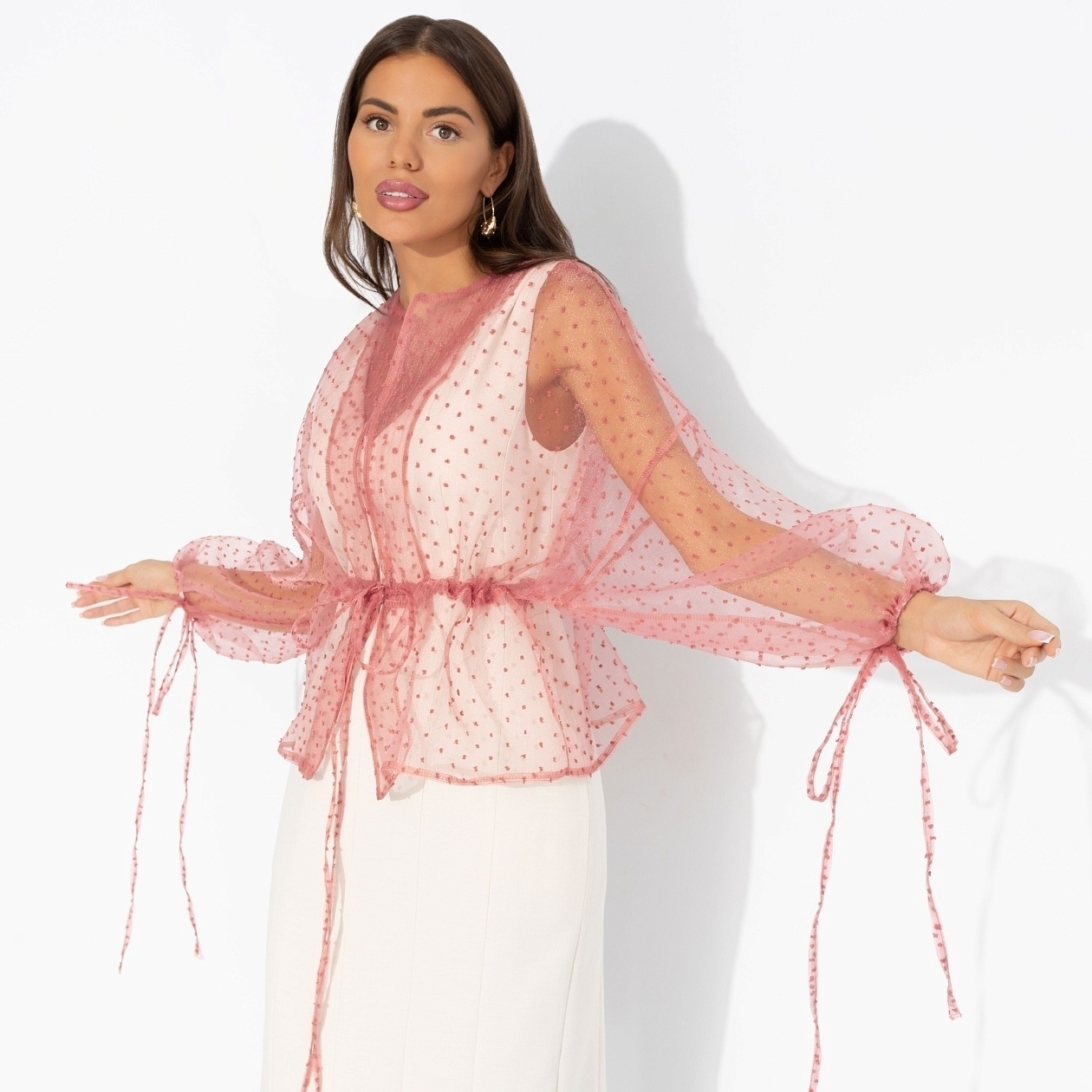 Жакет ЧАРУТТИ похож на леденец вкуса клубника со сливками. Мелкий горох рассыпан по ткани, как хрустальный сахар на поверхности сладкой глазури. Его силуэт обрамляет плечи с нежностью тающего во рту розового безумия. Восхищение, от которого не набираешь вес. Жакет на завязках. Линия плеча спущена. Посадка свободная. Изделие просвечивает.