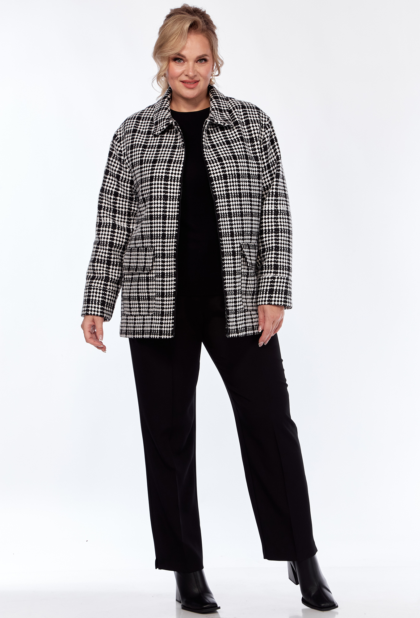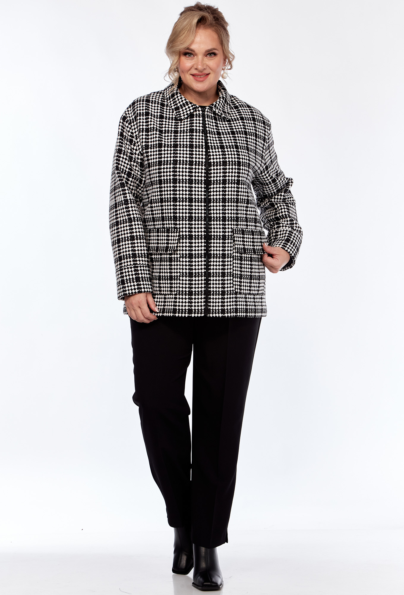 Модель: Элль-Стиль 2324 черный клетка..показать Рост: 164 см (девушка на фото ростом 170см) Сезон: Круглогодичный Тип ткани: Полиэстер 50%, вискоза 50%Жакет прямого силуэта, с отложным воротником, с застёжкой на молнию, линия плеча слегка спущена. На передней_x000D_