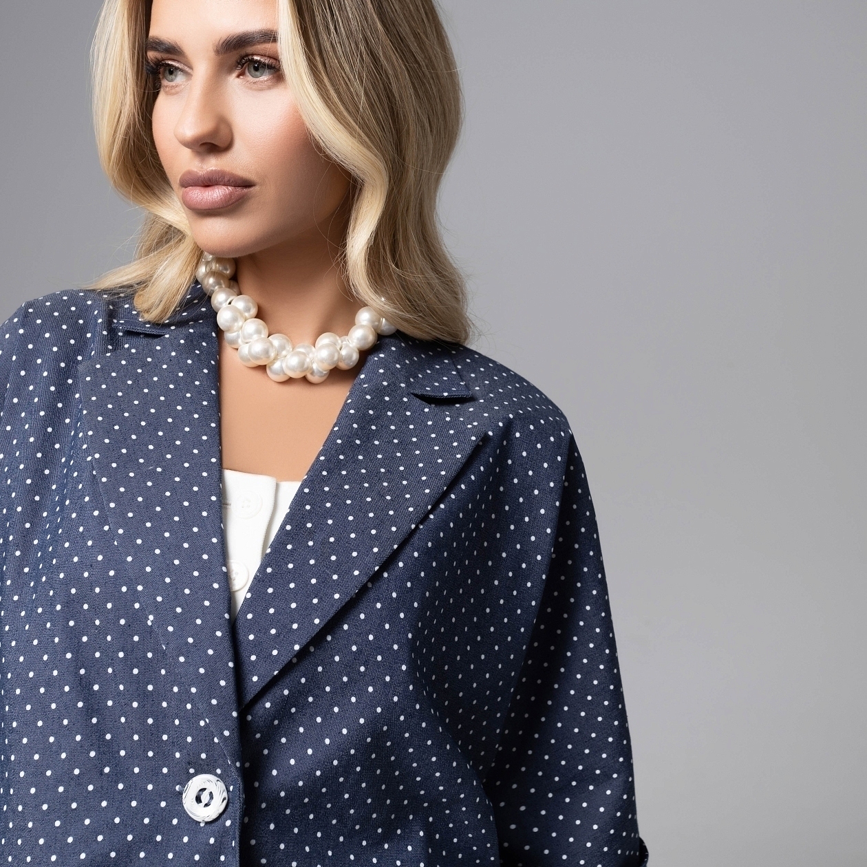 Жакет для Жаклин. Некогда первая леди ценила принт «горох». Величина горошин прямо пропорциональна уровню вкуса. Классический цвет денима делает жакет элегантным атрибутом повседневности. Жакет свободного кроя с лацканами, однобортный. Изделие с подплечниками и карманами, без подклада. Деликатные разрезы по бокам изделия. Хлопок хорошо держит форму. Можно стилизовать с юбками, брюками и джинсами.