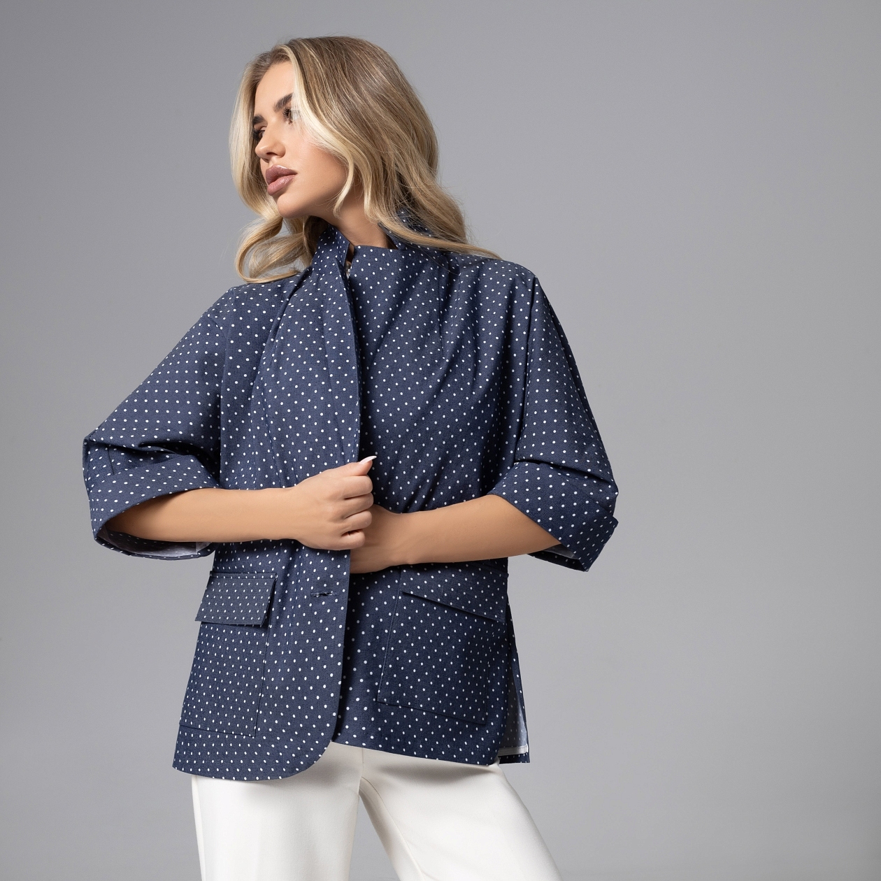 Жакет для Жаклин. Некогда первая леди ценила принт «горох». Величина горошин прямо пропорциональна уровню вкуса. Классический цвет денима делает жакет элегантным атрибутом повседневности. Жакет свободного кроя с лацканами, однобортный. Изделие с подплечниками и карманами, без подклада. Деликатные разрезы по бокам изделия. Хлопок хорошо держит форму. Можно стилизовать с юбками, брюками и джинсами.