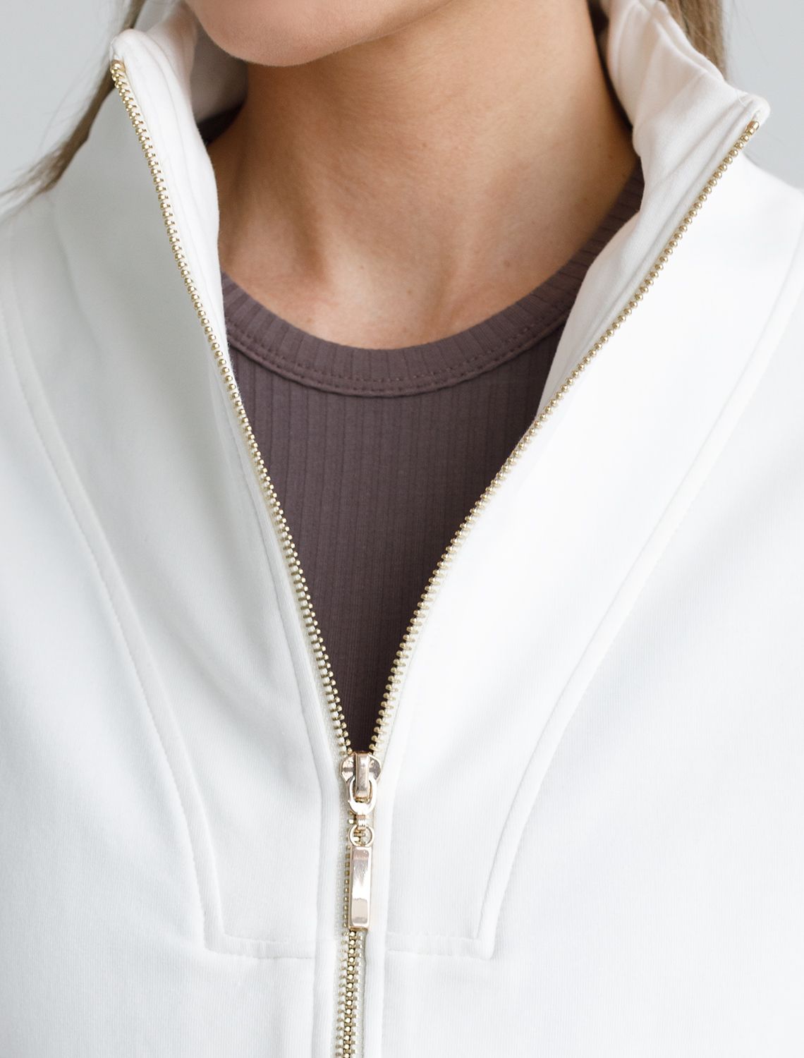 Жакет выполнен из футера двухнитки с эластаном. Модель без карманов с воротом стойка и застежкой на молнию золотистого цвета. Эластичный материал гарантирует комфорт и формоустойчивость. Сочетается в костюме с брюками D44.138, D44.139, D44.140 и шортами D48.008. Изделие дополнено металлическим логотипом бренда.