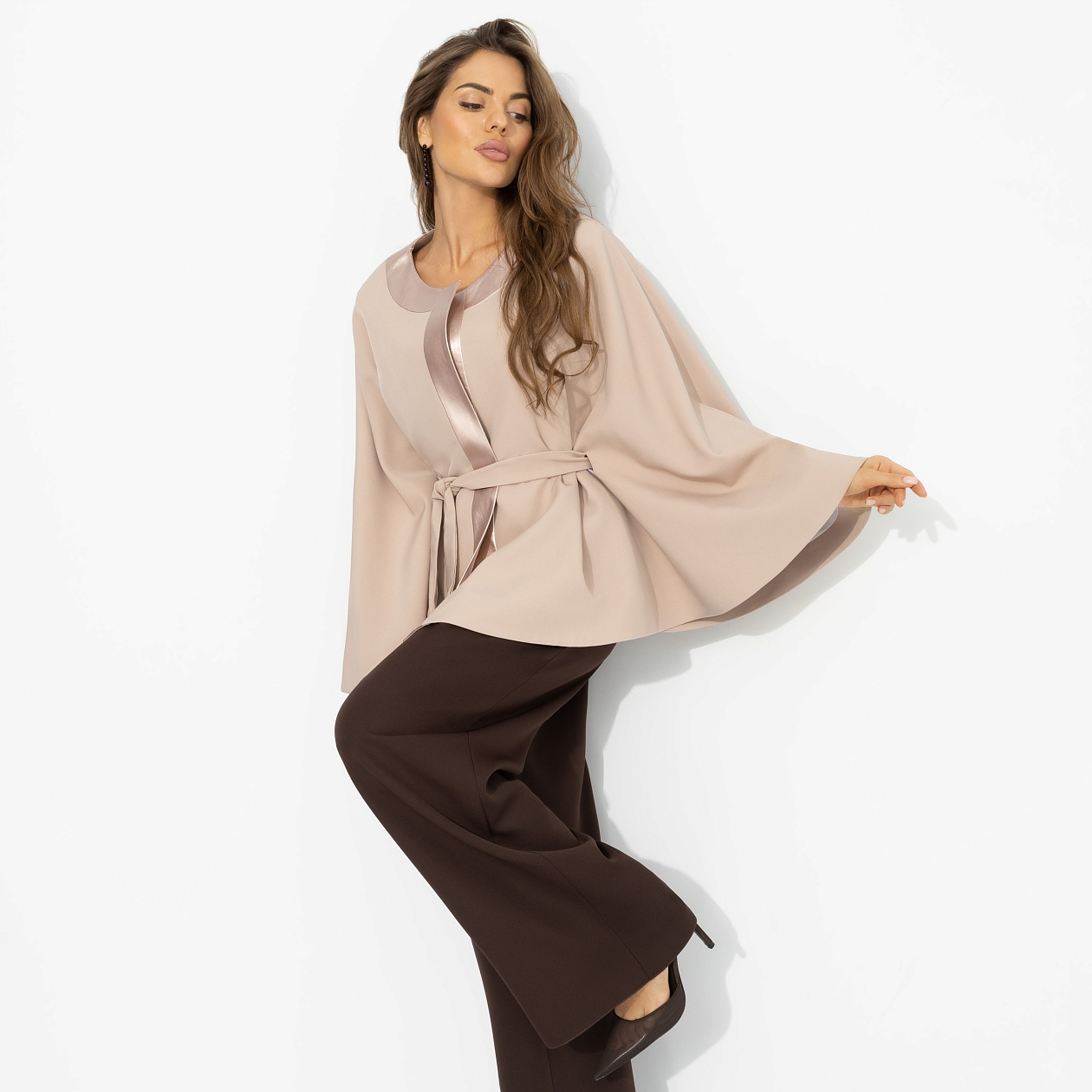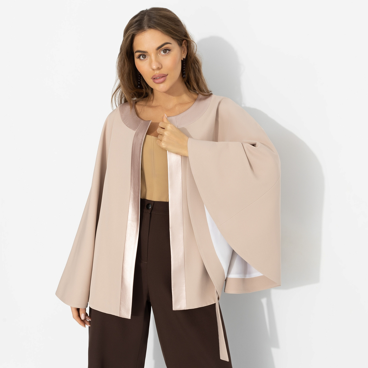 Жакет‑кейп на подкладе, Яркий эффект (пудра, с поясом)