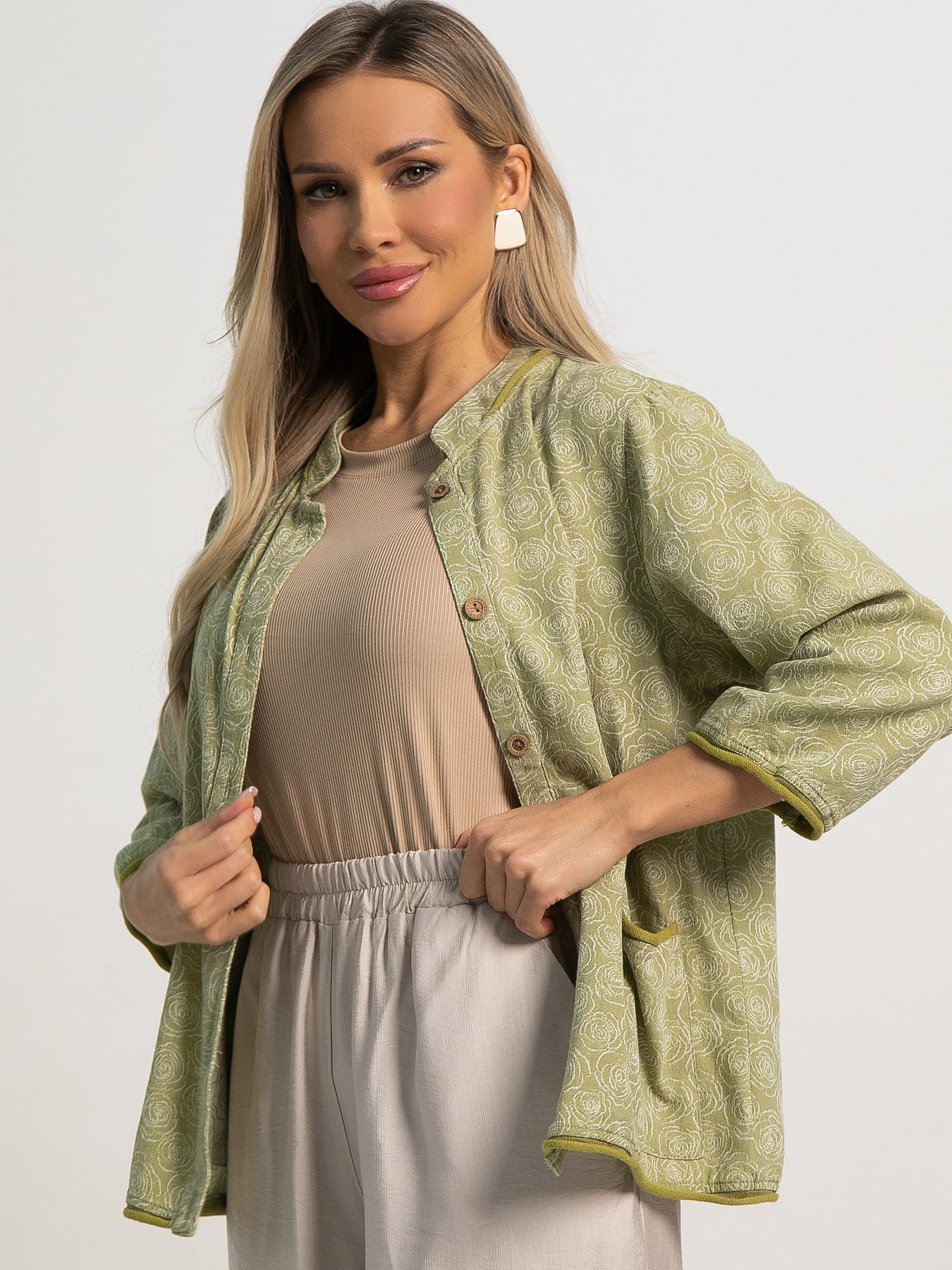 Элегантный летний жакет в изысканном оливковом цвете – это сочетание стиля и удобства. Он станет ключевым элементом вашего гардероба, придавая изысканность любому образу. Укороченные рукава обеспечивают свободу движений и идеально подходят для теплых дней, создавая ощущение легкости и непринужденности. Трикотажные детали украшают низ изделия, низ рукавов и воротник. Воротник-стойка плавно переходит в застежку на пуговицах, придавая жакету аккуратный и завершенный вид. Два накладных кармана на передней части не только практичны, но и добавляют стильный акцент. Они также украшены трикотажными элементами, гармонично дополняя общий дизайн жакета. Внесите нотку свежести и элегантности в свой летний гардероб с помощью этого стильного жакета!