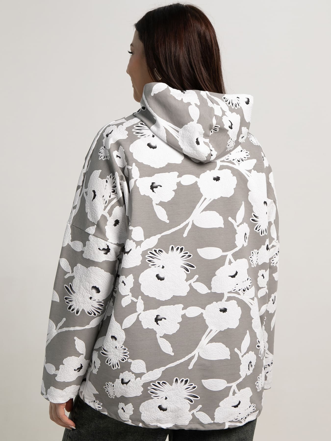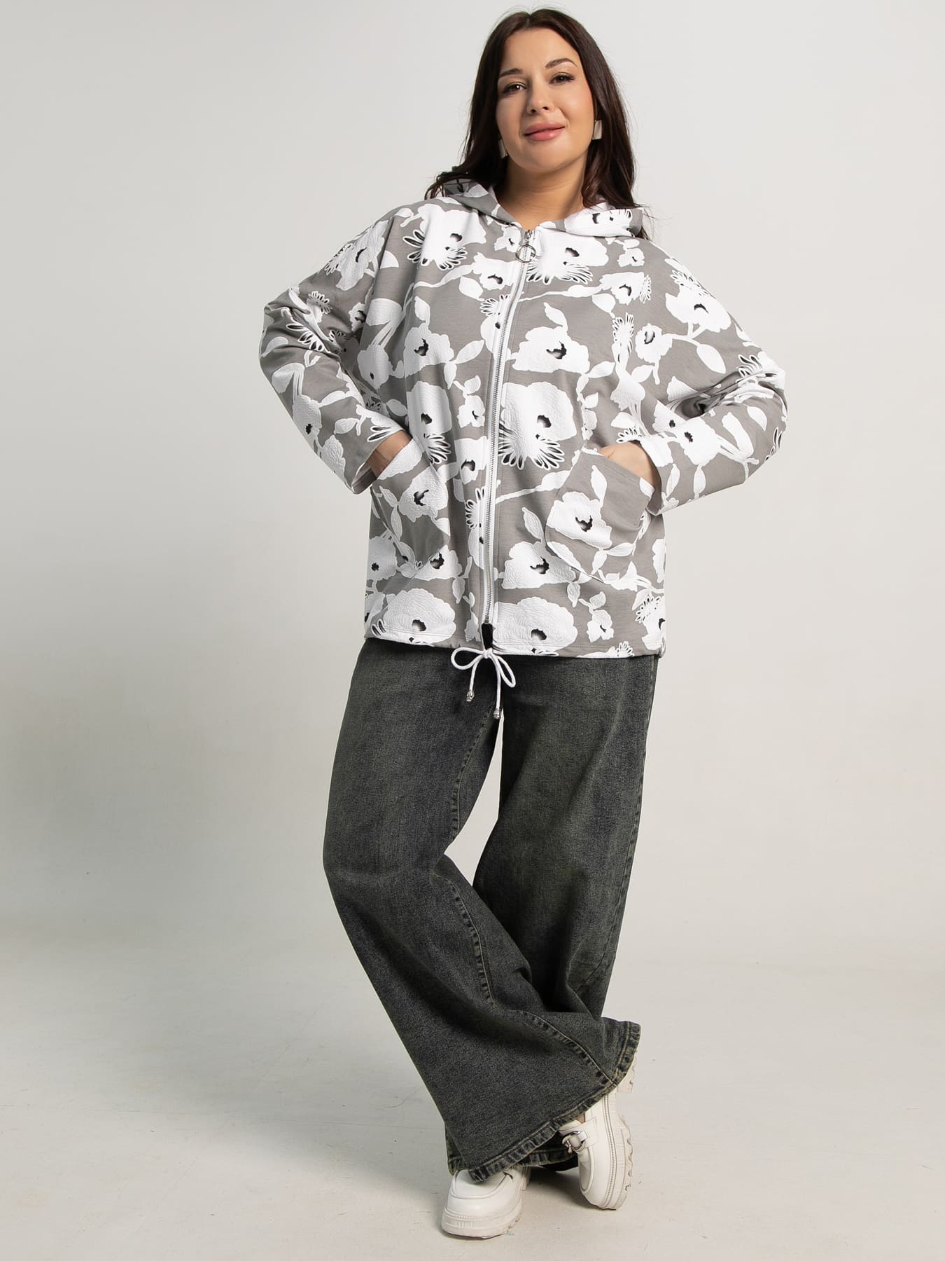 Женский жакет с капюшоном — это яркий и удобный выбор для повседневной носки. Свободный крой подходит для любой фигуры, обеспечивая комфорт и свободу движений. Цветочный принт придаёт образу свежесть и женственность. Спущенное плечо и длинные рукава создают расслабленный и модный силуэт. Удобная молния по всей длине облегчает надевание и снятие. На передней части есть два накладных кармана для мелочей, а внизу — затяжка со шнурком для регулировки посадки. Этот стильный жакет добавит свежести и женственности вашему гардеробу!