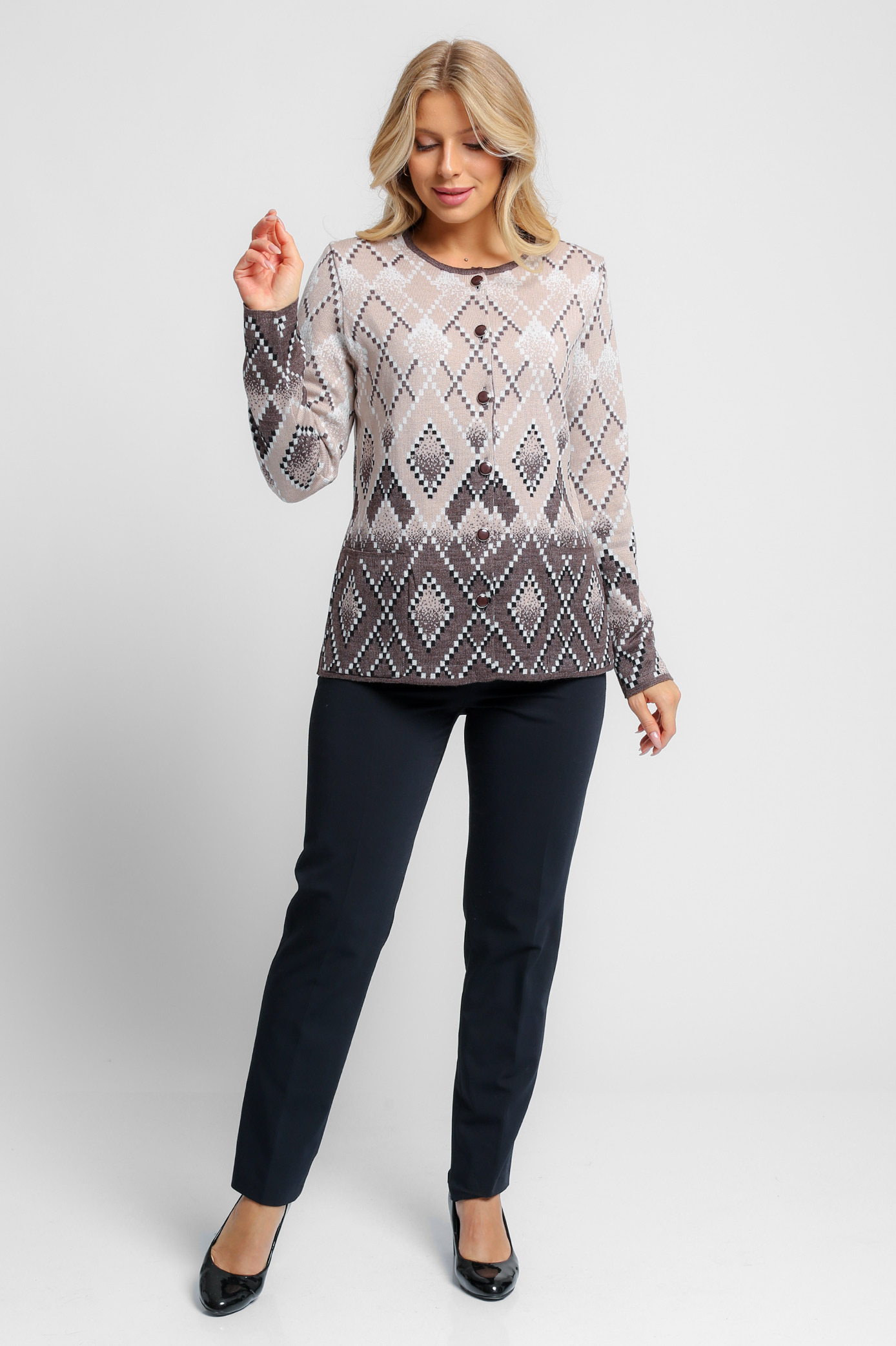 Женский трикотажный жакет полуприлегающего силуэта. Рукава втачные длинные. Жакет застегивается на пуговицы, горловина круглая. Два накладных кармана квадратной формы. Изделие выполнено жаккардовым переплетние образующим геометрический рисунок с цветовым переходом от светлого к темному. коричневый